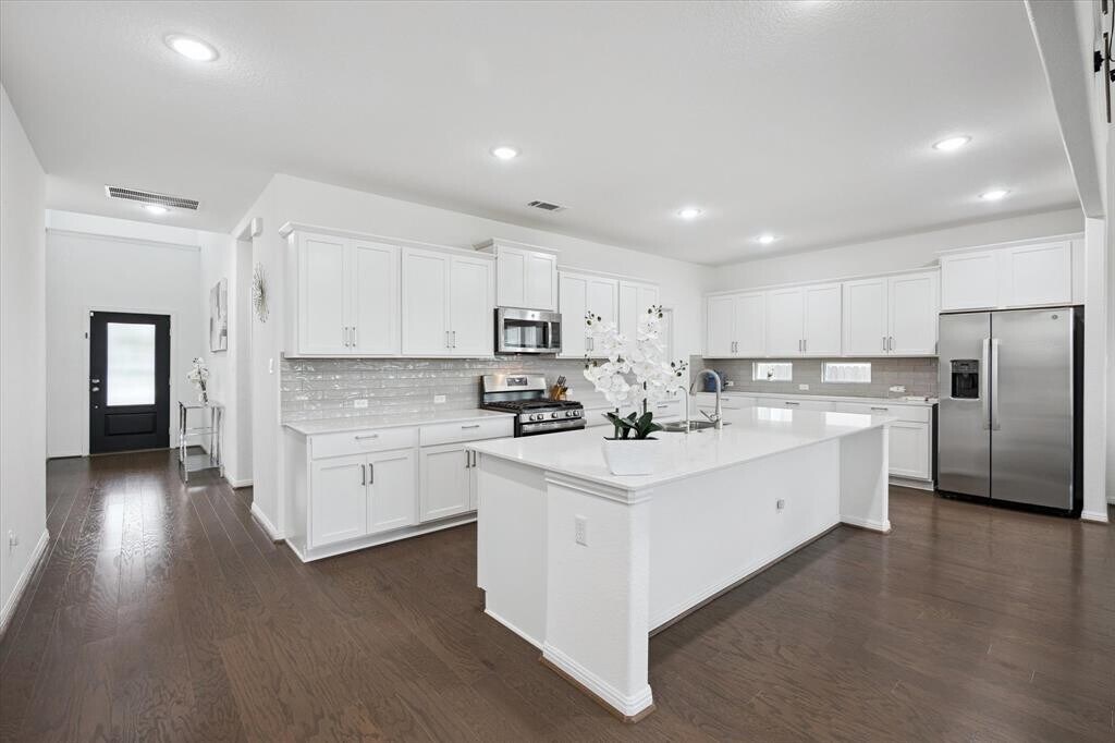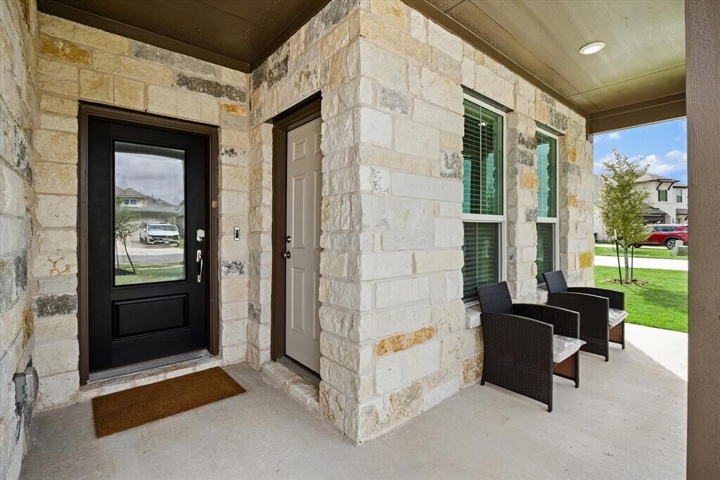 Nestled on a private north-facing cul-de-sac lot, this stunning stone and stucco home offers timeless curb appeal and a highly functional design. Inside, you’ll find hardwood floors, soaring vaulted ceilings, recessed lighting, and abundant natural light. The island kitchen showcases quartz countertops, abundant storage, and seamless flow into the living and dining areas. A next-generation guest suite with private entry is located downstairs, along with the luxurious main-floor owner’s retreat boasting a spa-like bath with an oversized walk-in shower. With 5 bedrooms, 3 full baths, and 2 half baths, the home also includes a game room and media room upstairs—perfect for entertaining. Outdoors, enjoy a covered patio and raised vegetable garden that overlook a protected greenbelt, creating the perfect backdrop for relaxation and privacy. Energy-efficient solar panels complete this exceptional package, blending elegance, comfort, and sustainability. Santa Rita Ranch is a master-planned community in Liberty Hill, Texas, featuring luxury single-family homes from various builders, along with a wide array of amenities including resort-style pools, waterslides, splash pads, and a comprehensive Wellness Barn for fitness. Residents also have access to numerous parks, miles of hike and bike trails, sports courts, a play park, and even a catch-and-release lake. The community fosters a fun, celebratory lifestyle with a dedicated director of fun and various community events like food trucks, fitness classes, and farmers' markets. Solar panels are leased at $71/month and EV Charger available in the garage.