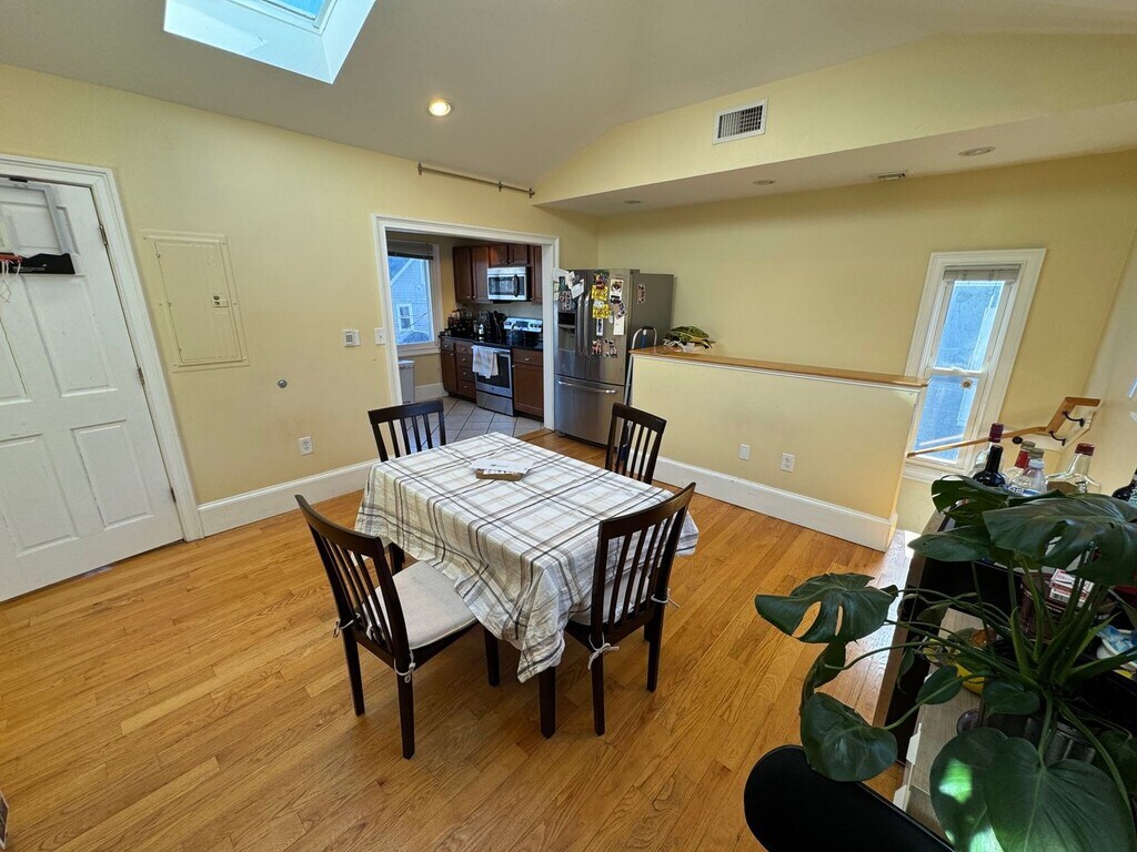 Davis Square Closest train = Davis Square (Red Line T) • 6 bed/3.5 bath (HUGE multi-level unit, second and third floor) • Views of Boston skyline from top floor • Beautiful hardwood floors throughout • Updated kitchen (new cabinets, stainless steel appliances, granite counters) • Updated bathrooms • Central heat & A/C • Free-use laundry machines