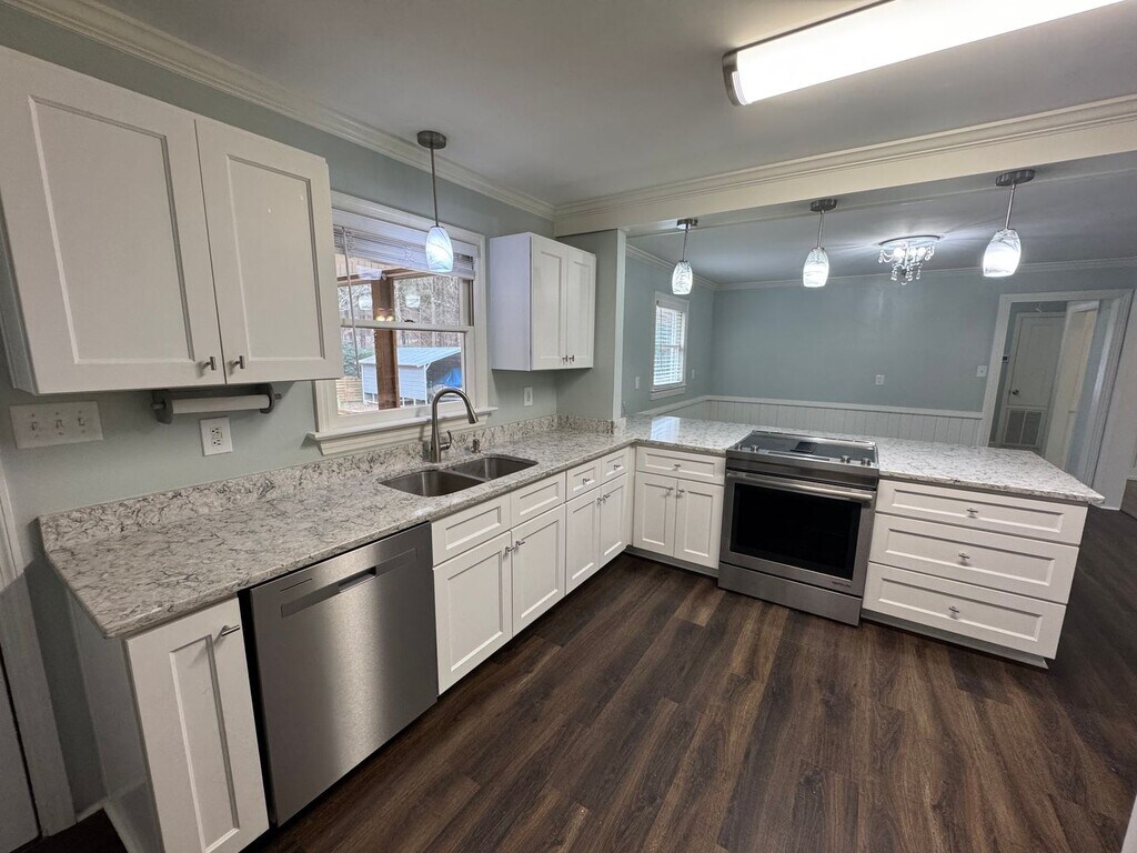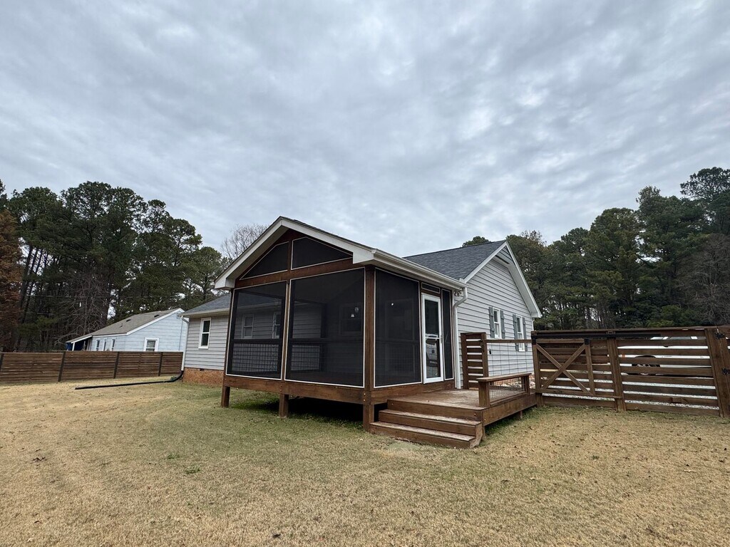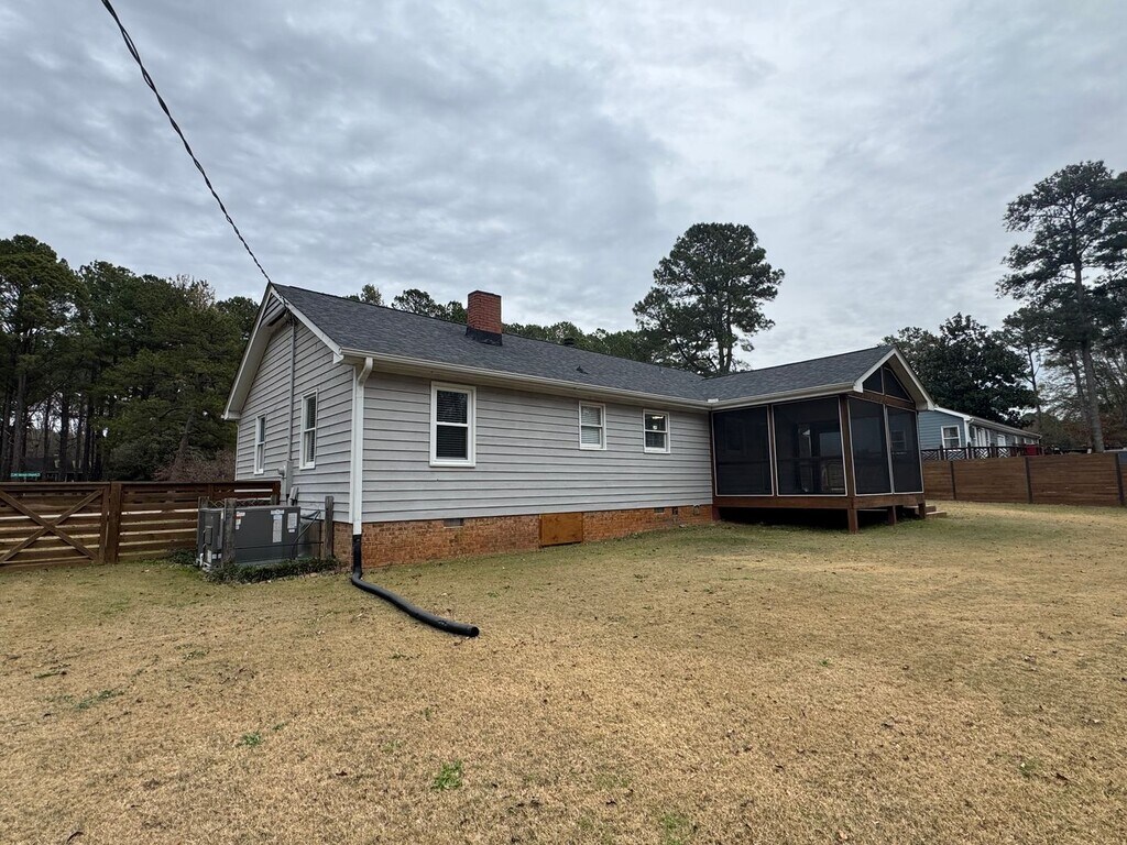 Welcome to this beautifully renovated single-story home in an exceptionally convenient Raleigh, NC location. Less than a 10-minute drive to numerous shopping, dining and entertainment attractions including the A. E. Finley YMCA, Target, Whole Foods, Panera Bread, Starbucks, Chick-fil-a and more. This charming property offers the perfect blend of comfort, style, and functionality. Inside, you’ll find an open-concept living, dining, and kitchen layout with a breakfast bar which is ideal for everyday living and entertaining. The kitchen is a chef’s dream, featuring granite countertops and stainless-steel appliances, while hardwood floors throughout add warmth and sophistication. The home includes three spacious bedrooms, highlighted by a primary suite with vaulted ceilings and exposed beams that create striking architectural character, along with a private en suite bathroom. Two well-appointed full bathrooms provide comfort and convenience for residents and guests alike. A washer and dryer are included, and central HVAC ensures year-round comfort. Step outside to enjoy true outdoor living. The large, fully fenced backyard is perfect for relaxing, entertaining, or letting a dog safely roam. A generous screened-in porch allows you to enjoy North Carolina’s beautiful weather in comfort. The covered utility shelter is perfect for storing recreational gear and equipment such as lawn mowers, bicycles, kayaks, and motorcycles. The home is located in a quiet and serene setting which offers a peaceful atmosphere and a strong sense of privacy. Don’t miss the opportunity to call this exceptional Raleigh gem your new home. Contact us today to schedule a tour! $50 Application Fee per occupant $2,300/Month Rent $2,300 Security Deposit $250/Pet - Pet Fee (no cats) $10/Month Pet rent Tenant pays all utilities.