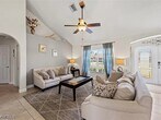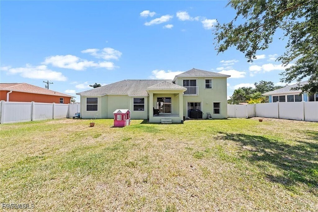 Welcome to one of Cape Coral’s most vibrant and family-friendly neighborhoods! From the moment you enter this beautifully maintained community,you’ll notice a true sense of pride of ownership. Just two blocks away,Saratoga Lake Park offers the perfect setting for outdoor fun with its playground,picnic areas,BBQ grills,and scenic lake,not to mention regular neighborhood gatherings like bonfires,hot dog nights,and weekend cookouts. And then you see it — a stunning,non-cookie-cutter two-story home that stands out for all the right reasons. Thoughtfully maintained and beautifully designed,this home features a spacious split-level floor plan with high ceilings,an abundance of natural light,and both a formal living room and a separate family room. Upstairs,a versatile loft space sits just outside the generous primary suite,perfect for a home office,playroom,or creative nook. The primary bath includes a walk-in shower and a luxurious garden tub. The kitchen is equally impressive,with Corian countertops,ample cabinet space and pantry,all with a view of the fenced-in backyard,perfect for pets or children. Additional highlights include a sprinkler system,security wiring,and full cable setup.