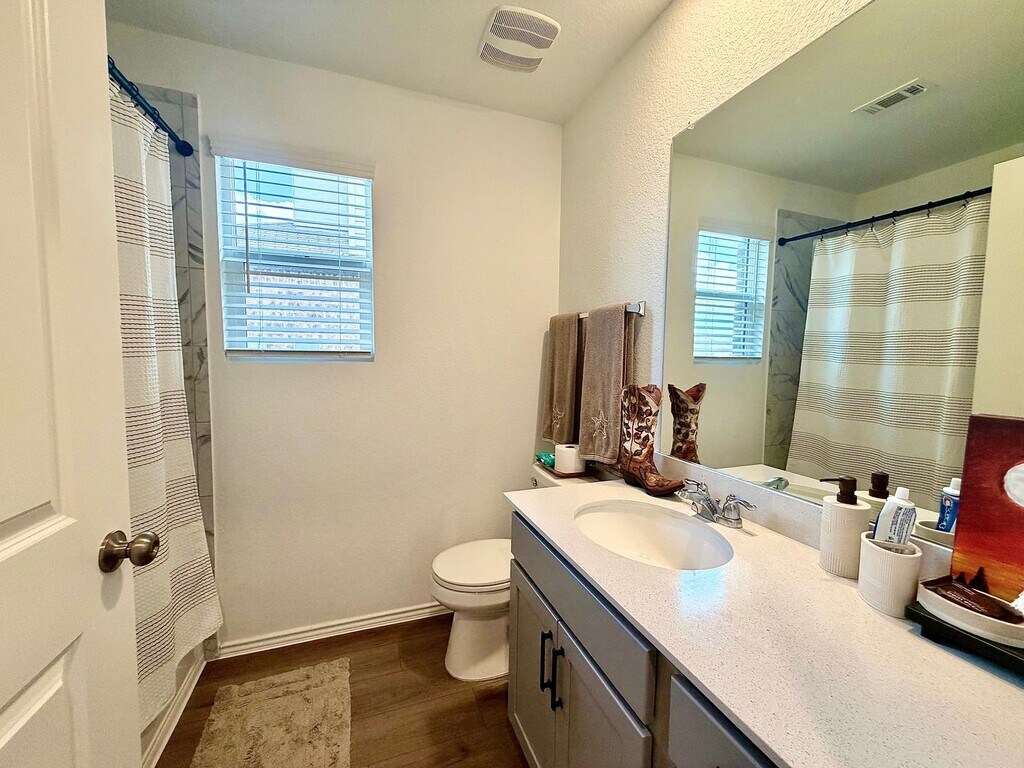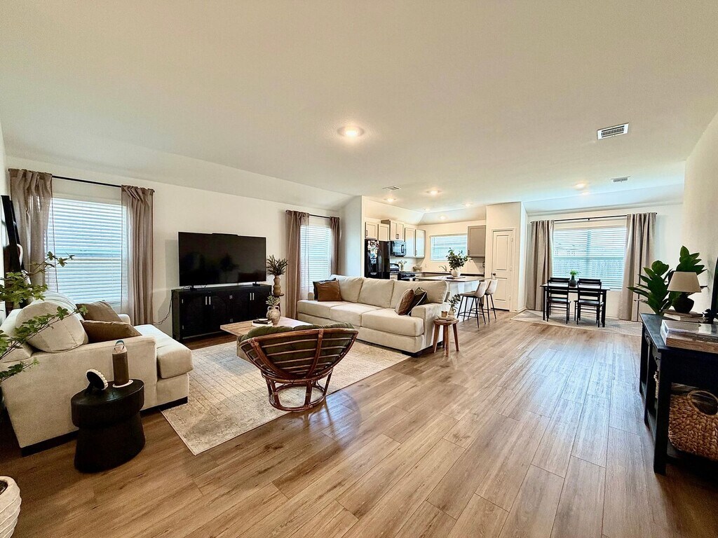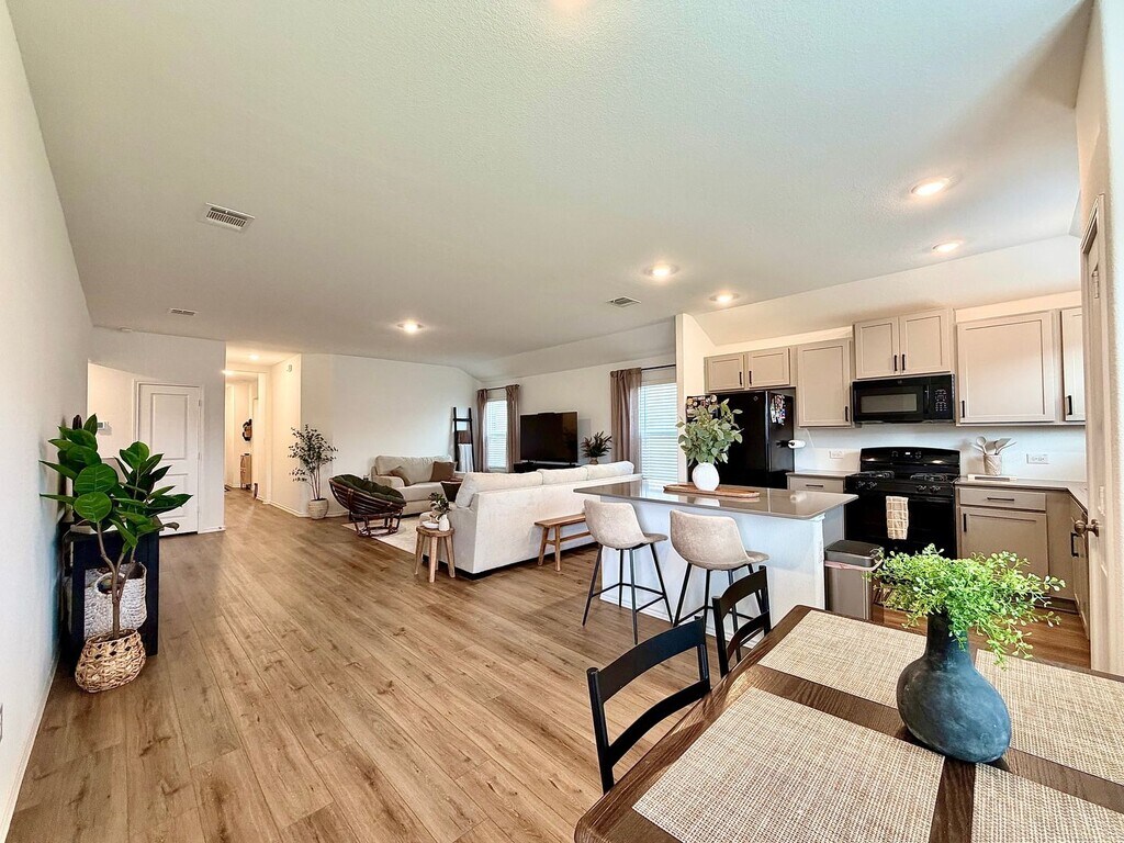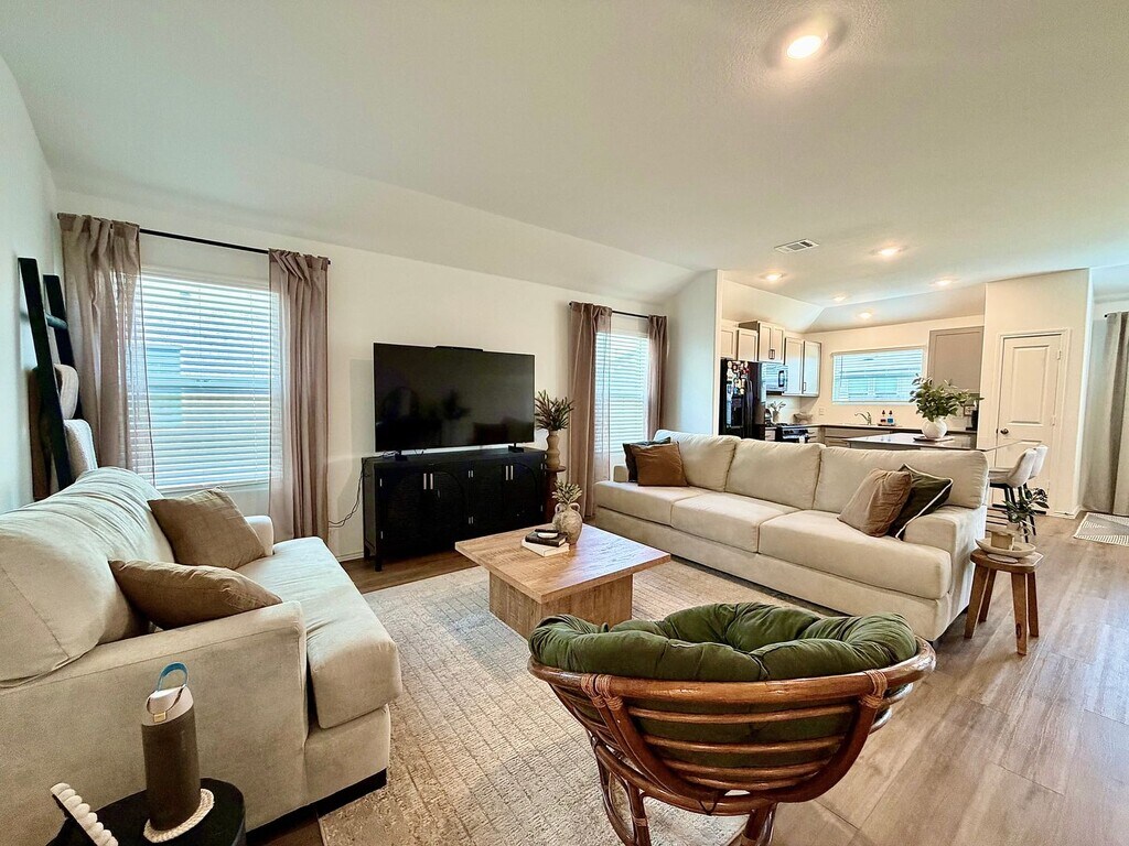 This stunning, single-story home located in the new Whisper subdivision in San Marcos, TX boasts 3 spacious bedrooms and 2 full bathrooms, with nearly 1650 sqft of living space. The open floor plan is accentuated by vinyl wood floors and recessed lighting, creating a bright and inviting atmosphere throughout the home. The kitchen is open to the dining and large living area and includes solid surface countertops, refrigerator with ice maker, a gas range, and a built-in microwave. The master suite is separate from the secondary bedrooms and features a dream worthy walk-in closet double vanities, a soaking tub and a stand up shower. The home also includes a two-car garage and a fully fenced backyard, perfect for outdoor activities. What sets this home apart is its commitment to energy efficiency, with solar panels and other energy-efficient features. This home is not just a place to live, it's a lifestyle. Come and experience it for yourself! This property is occupied. Please allow 24 hours for showings. You may schedule a showing through your real estate agent or contact our office directly. For additional property details, our contact information or to apply for this rental, please visit our website at: Please know, applications will only be accepted from our website.