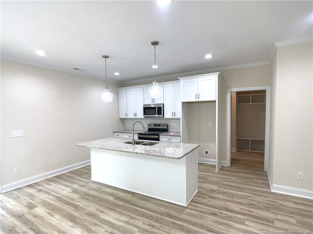 Stunning New Construction Home in in the sought-after Haymount neighborhood. This beautiful two-story residence features 5 spacious bedrooms and 3.5 luxurious bathrooms, offering ample space for family living and entertaining. Elegant LVP flooring throughout, complemented by granite countertops and crown molding that enhance the entire first floor. Two custom tile showers- kitchen island- walk-in closet for ample storage- extra room off Master as office or storage option. Fenced backyard. Covered back deck. 2 car garage. Conveniently located minutes to Seagra Stadium, Downtown Fayetteville restaurants, Fort Bragg, shops and minutes to Fayetteville Festival Park.