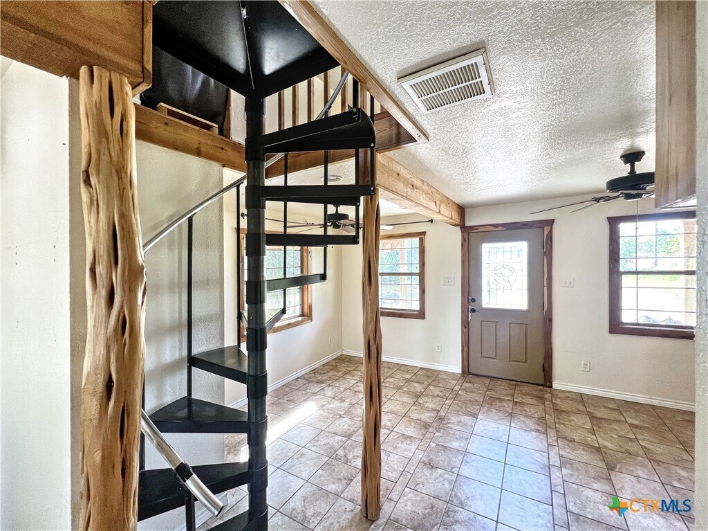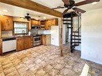 Charming country cabin with plenty of character and privacy. This two-story home sits behind a gated driveway for added security and features a classic A-frame style roof with a welcoming front porch. Inside,the open floorplan includes a warm kitchen with custom wood cabinets,stainless steel appliances,and tile floors throughout the main level. A spiral staircase leads upstairs to a spacious loft with access to a private balcony overlooking the property. The home has multiple covered porches for relaxing outdoors and sits on a pier-and-beam foundation,giving it a true cabin feel. Mature oak trees surround the lot,offering shade and a peaceful setting just minutes from town.