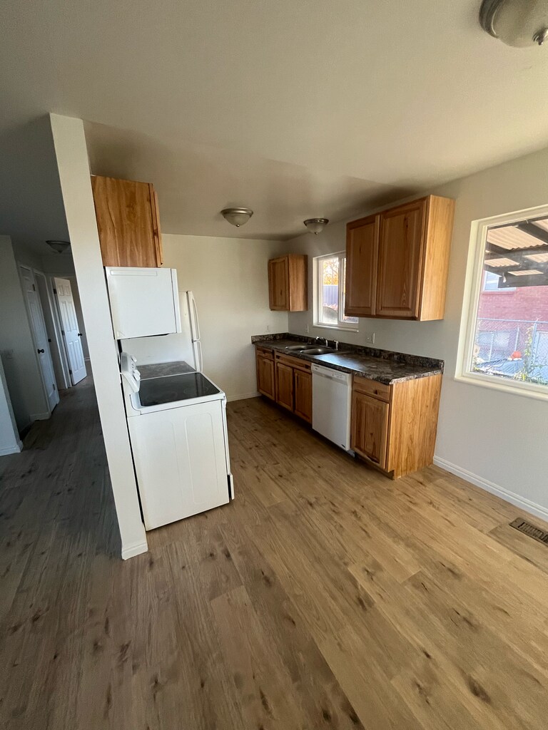 Spacious updated twin home. Two large living areas 4 beds and 2 full baths. Brand new flooring, tile showers. Private patio and back yard. Fresh carpet and paint. All bedrooms are good sized. Fully fenced back yard, carport, shade trees. Great neighborhood near park. Close to Roy's High School, Junior High and Municipal Elementary.Marketed by All America Real Estate-Trent Loveland