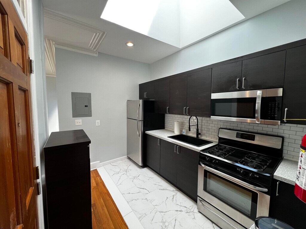 Located on Sherman Place in the Jersey City Heights, this well-maintained apartment offers a comfortable and flexible layout with separate living and dining areas. The space features hardwood floors, high ceilings, oversized windows, two skylights, and beautiful stained glass details that add character throughout. Built-in interior window covers provide both privacy and a clean, finished look. The living room features pocket doors, allowing it to be closed off for additional privacy or used as a separate sleeping area if needed. One of the bedrooms includes an additional smaller room which works well as a home office, walk-in closet, or nursery. The kitchen includes a gas range, refrigerator, and microwave, with a layout that allows for easy everyday use. The building offers a coin-operated washer and dryer in the basement, along with a designated storage area. Bike storage is available, with space under the back deck for regular use and an additional shared basement area for winter storage. A shared front porch provides a welcoming outdoor space for sitting and relaxing. One parking space is included in the rent and fits a small to mid-size vehicle. A second space is available for $200/month. Larger vehicles may be subject to an additional monthly charge. Conveniently located near neighborhood favorites including The Hutton, The Franklin, Corto, Low Fidelity, and Bread & Salt, as well as outdoor spaces like Pershing Field Park and Riverview-Fisk Park. Easy access to shopping, parks, and bus lines with connections to Journal Square and surrounding areas. Available immediately.