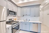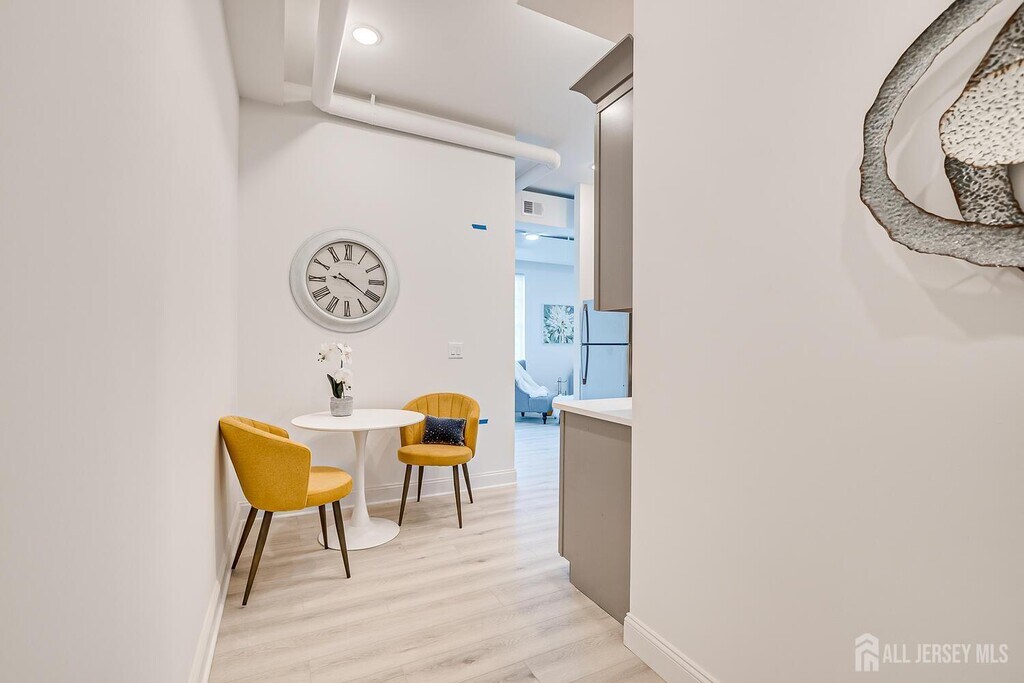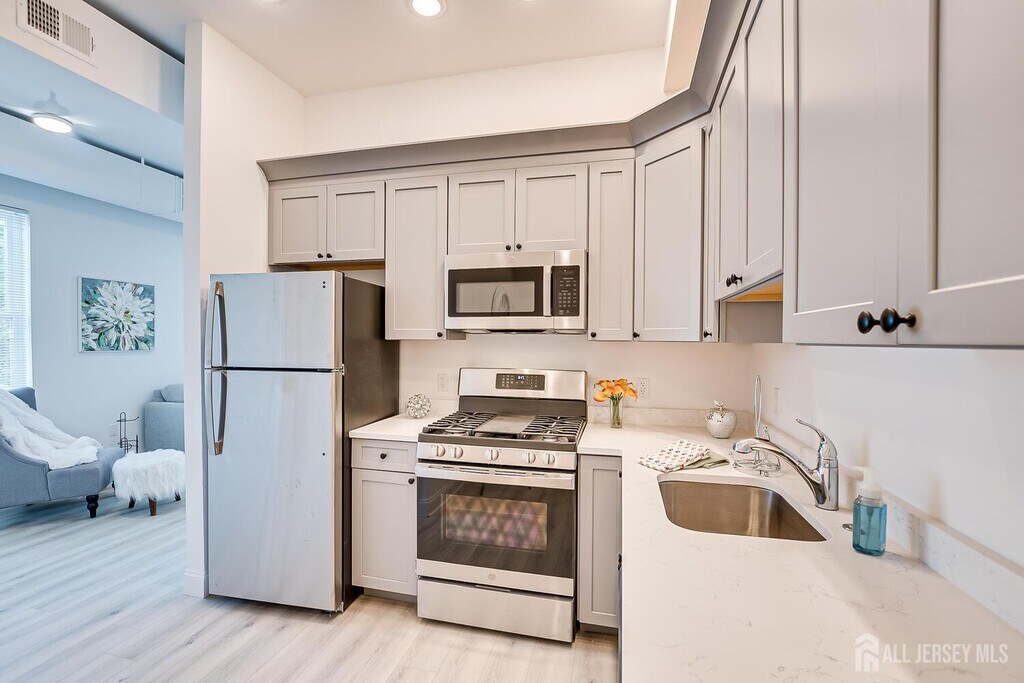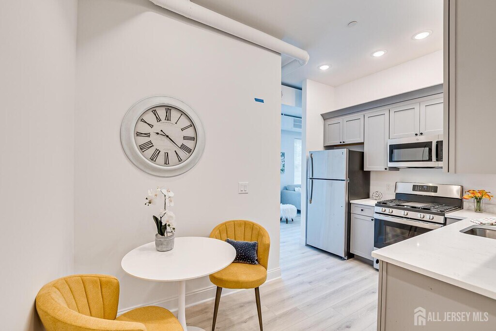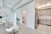 Lovely one bedroom unit with high ceilings,wood style floors. The kitchen has quartz counters and stainless appliance. There is good cabinet space for all who love to cook. Nice size bath with shower stall. Washer/dryer is in Unit. You will also love you balcony. There is also a rooftop deck for common BBQ for the tenants use. This is a great location only 1/2 block to the train. Right in center of downtown. There is parking available if need for monthly fee.