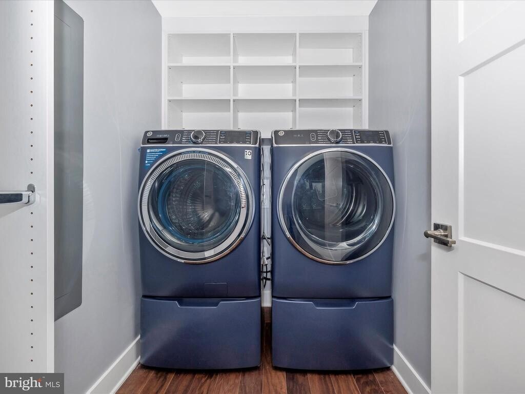 Rare opportunity to live in the prestigious Visitation condominium community located in the heart of downtown Frederick. Just 2 years new in a building of just 10 units. Secured entrance, private 2 car garage with extra storage space, and convenient elevator access. Floor to ceiling windows across the width of this unit provide exceptional natural lighting and views of the gardens on East Church Street. This one-bedroom home boasts 2 generous sized walk-in closets with custom organizers to maximize the space and an on-suite with double sinks and spacious walk-in shower. The laundry room with energy efficient front load washer & dryer are conveniently located in the primary suite. The open concept floor plan provides flexibility in placing furniture to meet your personal needs for living or dining space. The gourmet kitchen features a 12 foot quartz peninsula with a waterfall edge, complementing the interior space's dramatic design. Top-tier amenities include 42 inch cabinets with soft-close hinges, under counter lighting, a subway tile back-splash, and smart stainless appliances. Additionally, a den with French doors offers versatility as a home office or guest room. Completing the interior space are a second full bath, utility room, and walk-in coat closet. Notably, this home boasts one of the longest, deepest balconies in the building while a porch roof provides weather protection. This home is available for quick occupancy subject to strict qualifying credit score and income requirements.