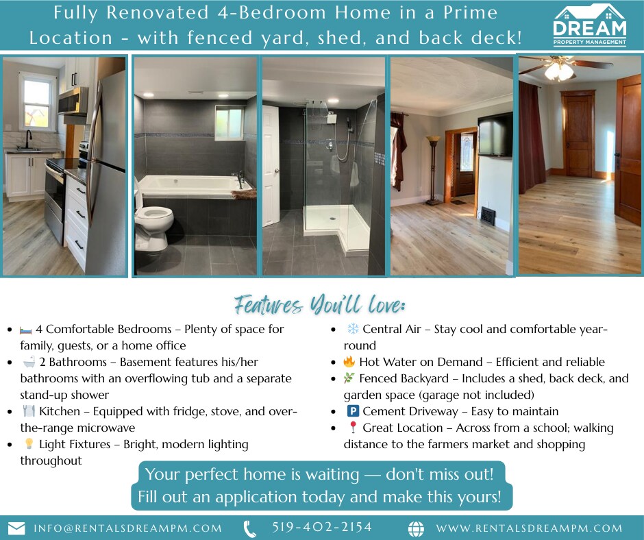 Fully Renovated 4-Bedroom Home in a Prime Location - $2300/mo plus utilities Step into a home that offers both space and convenience, featuring 4 bedrooms, a private fenced yard, a shed, and a back deck. Perfectly situated across from a school and close to local amenities, this property provides a balanced lifestyle for families and professionals alike. Features You'll Love: -4 Comfortable Bedrooms - Plenty of space for family, guests, or a home office -2 Bathrooms - Basement features his/her bathroom with an overflowing tub and a separate stand-up shower -Kitchen - Equipped with fridge, stove, and over-the-range microwave -Light Fixtures - Bright, modern lighting throughout -Central Air - Stay cool and comfortable year-round -Hot Water on Demand - Efficient and reliable Extra Features You'll Enjoy: -Fenced Backyard - Includes a shed, back deck, and garden space (garage not included) -Cement Driveway - Easy to maintain -Pet-Friendly - Furry friends are welcome! (Restrictions apply) -Non-Smoking - Clean and fresh environment -Great Location - Across from a school; walking distance to the farmers market and shopping Location Highlights: *Schools: -PE McGibbon Public School (140m) -Royal SCITS Academy (750m) -Hanna Memorial Public School (1.3 km) -St. Matthew Catholic School (1.5 km) *Healthcare: -Bluewater Health (1.3 km) -Mackenzie Clinic (1.2 km) -Eltanty Sarnia Dental (1.8 km) *Shopping & Amenities: -Food Basics (1.1 km) -Downtown Market (1.6 km) -Tim Hortons (2.5 km) -London Road Shopping Centre (3.8 km) Tenant Requirements: (Only qualified applicants will be contacted!) -First and last month's rent + Key deposit -Tenant's insurance -Credit check & References -Online Application: -Tenant pays for all utilities Don't miss out - Fill out an application today and make this yours! -Email: -Call: -Online Application: Your perfect home is waiting - don't miss out! If you need assistance, contact us - we're happy to help! *Disclaimer: Distances are approximate based on Google Maps. All information provided is deemed reliable but is not guaranteed and should be independently verified. Please note that all rental agreements must comply with the Residential Tenancies Act of Ontario.