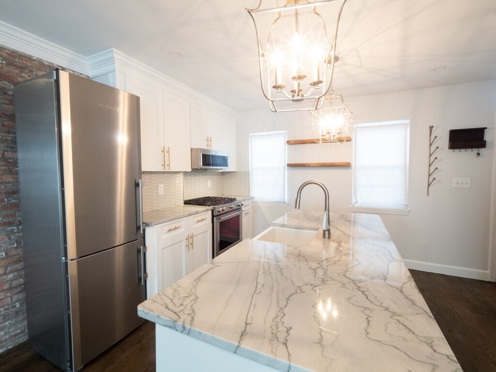 This beautifully renovated 2-bedroom,2-bath single-family townhouse blends timeless Cambridge charm with modern sophistication. Spanning three levels plus a partially finished basement,it features a designer kitchen with granite countertops,a farmhouse sink,premium KitchenAid appliances,and an artisanal backsplash. The open dining and living areas showcase a historic (non-operational) fireplace and refined architectural detail. Upstairs,spacious bedrooms and spa-inspired baths offer comfort and style. Perfectly situated near MIT,Harvard,and the Red Line,this exceptional home combines classic elegance with contemporary luxury and urban convenience. Professionally managed. Available 1/1/2026. MLS# 73448199
