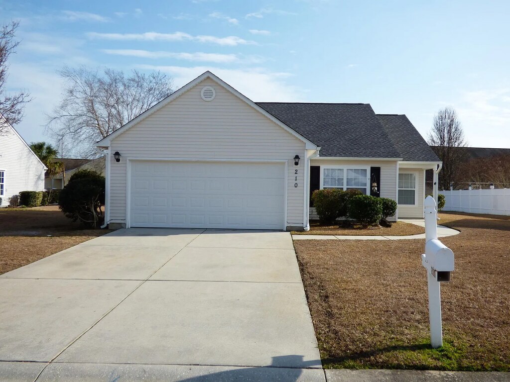 Welcome to 210 Tibton Circle, located in the desirable Palmetto Glen community in Myrtle Beach, SC. This single-family home offers approximately 1,479 square feet of living space with three bedrooms, two bathrooms, and an attached two-car garage. Built in 2005, the home sits on a 0.21-acre lot and provides comfortable and functional living in a well-maintained neighborhood. The interior features a spacious, open-concept layout that connects the living, dining, and kitchen areas, creating an ideal space for everyday living and entertaining. The kitchen includes stainless steel appliances, granite countertops, and a tile backsplash. Throughout the home, you’ll find a mix of vinyl flooring, hardwood, and carpeting, along with installed window blinds and updated lighting. The primary suite includes a walk-in closet and an en-suite bathroom. Two additional bedrooms are located on the opposite side of the home and share access to a full bathroom. The laundry room includes washer and dryer hookups. Palmetto Glen is a quiet residential neighborhood offering a community pool and maintained common areas. The home is conveniently located near shopping, dining, major roads, and area beaches. Nearby schools include Lakewood Elementary, Forestbrook Middle School, and Socastee High School.