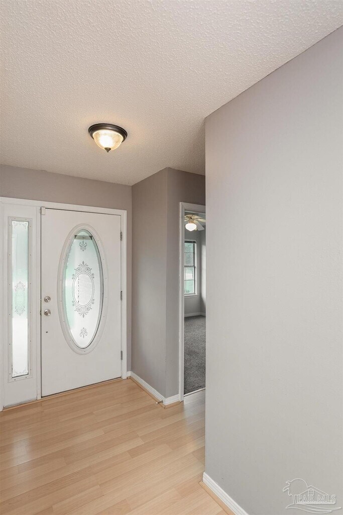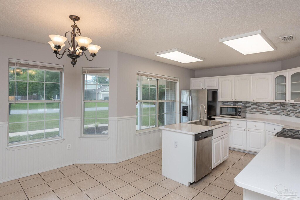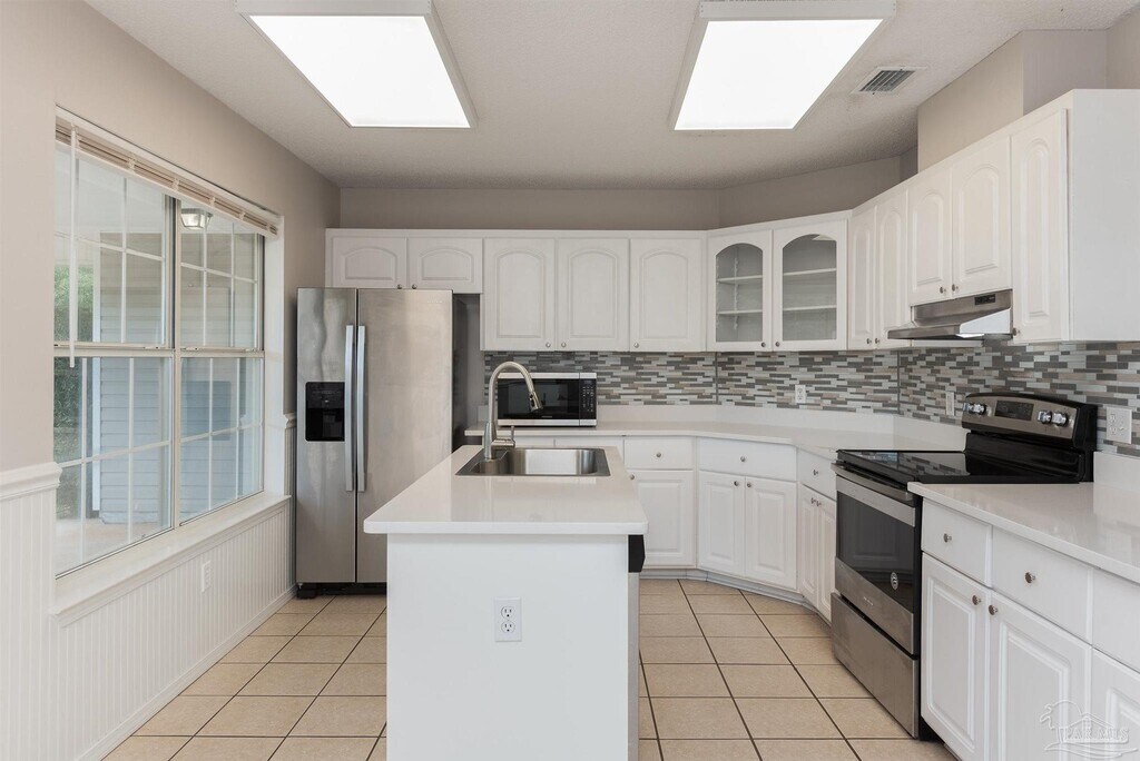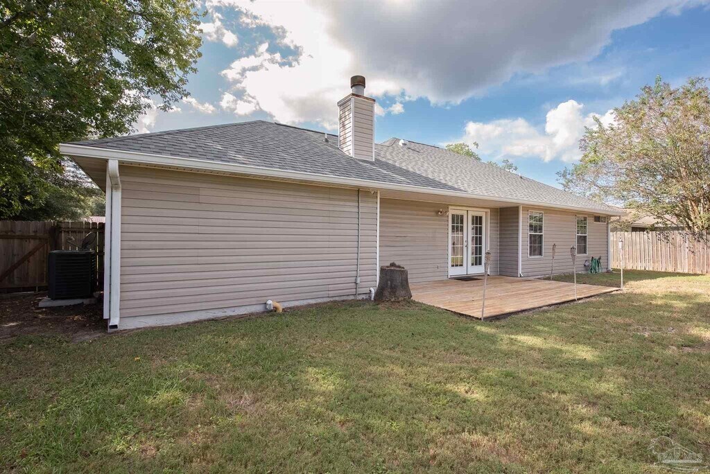 Welcome home to this charming Navarre house filled with light,character,and style. Inside,you’ll find a gorgeous main living area with vaulted ceilings and a striking brick fireplace as the centerpiece. French doors open to a back patio overlooking the spacious,fenced backyard with plenty of room for gardening,grilling,or just relaxing. The large kitchen is a true highlight,featuring white shaker cabinets,a beautiful backsplash,stainless steel appliances,and an island that provides extra prep and storage space. A separate breakfast bar opens directly to the living area,making it easy to entertain or enjoy casual meals. Wainscoting details add extra charm,and the many windows throughout bring in plenty of natural light. The primary suite is a relaxing retreat with a tray ceiling,a sliding barn-style door to the ensuite bath,and a large walk-in closet with built-in wood shelving. Both bathrooms feature thoughtful,updated finishes,and the bedrooms are carpeted for comfort. An attached single-car garage includes laundry machines and offers added storage or flexible use as a workout room or workshop. With its inviting design,thoughtful layout,and oversized fenced yard,this house is ready to welcome you home.
