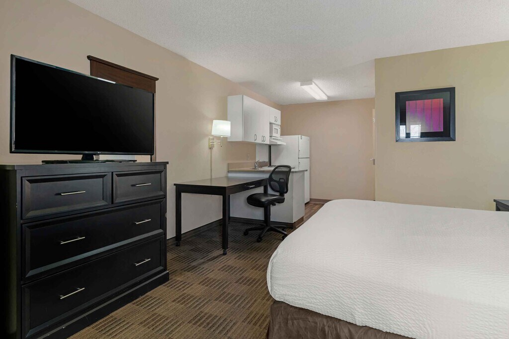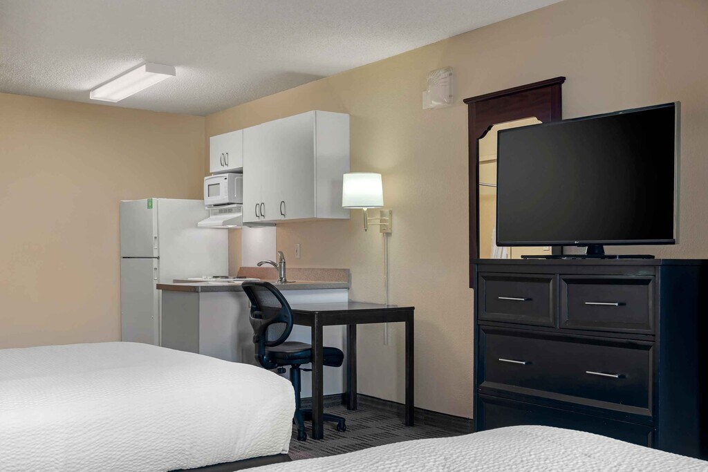 Enjoy a fully furnished studio suite in our hotel at an affordable rate with free wi-fi, free utilities and free premium cable. Each studio suite has a full kitchen with full-size refrigerator, stovetop and microwave, and has a flexible workspace and plenty of storage. All our hotels are pet-friendly and have on-site guest laundry available. Plus, there are no long-term commitments and you can adjust your length of stay to meet your individual needs, subject to applicable property and/or local restrictions. Additional fees may apply. Booking restrictions and taxes apply. Rates and availability are subject to change without notice.