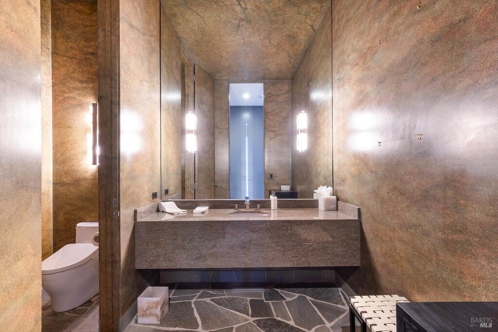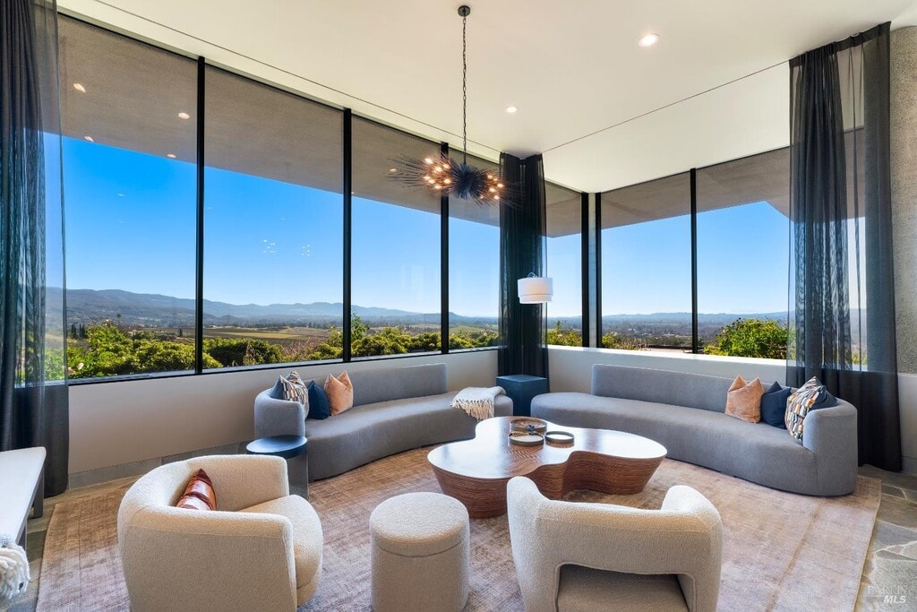 Designed for five-star resort living, this private, serene vineyard Estate includes an infinity-edge pool with dual baja shelves and spa, a full gym, sports court, new tennis court, putting green, fire pit, gourmet outdoor kitchen, large TVs, overhead heaters, and mesmerizing views. Easily venture out to Yountville, St. Helena, and downtown Napa or out for a round of golf at the Silverado PGA golf course just down the road. Perched atop 43.78 private acres, this 11,000 sq ft 5 bedroom, 4.5 baths breathtaking Napa Valley estate offers unparalleled 360-degree views. Built in the style of Frank Lloyd Wright, the residence showcases exquisite masonry with native stone, blending beauty, comfort, and sophistication. Each space is intentionally crafted, from the expansive living room with a custom bar and fireplace to the state-of-the-art media room, wine cellar, and game-ready billiards room. The newly remodeled kitchen opens to a welcoming family room and covered BBQ terrace, and the formal dining room which comfortably seats 16 guests. The primary suite acts as a sanctuary, featuring a spa bath, sitting room, and private terrace. MLS#325059525