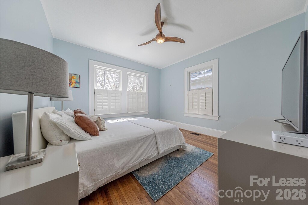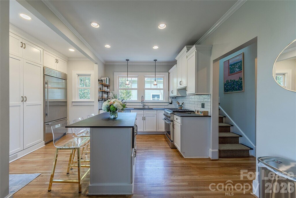 Fully furnished 3 bedroom,2 bathroom home on a quiet,tree-lined street in Myers Park,just minutes from Uptown Charlotte,restaurants,shopping,and everyday conveniences. Hardwood floors run throughout the main and upper levels,with multiple living areas that give the home a comfortable,spacious feel. The remodeled kitchen opens to the main living space and features stainless steel appliances,gas range,custom cabinetry,built-in shelving,a butler’s pantry,and wine/beverage fridge. Upstairs,the primary suite includes a loft sitting area,large custom walk-in closet,and updated bath. The home also features a Sonos sound system and Peloton bike,along with flexible spaces that work well for relaxing,hosting,or working from home. Outdoor spaces include a covered front porch and a large back deck overlooking the professionally landscaped yard. Professionally staged and move-in ready with utilities,high-speed internet,and landscaping included. MLS ID CAR4356643