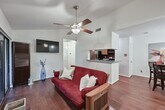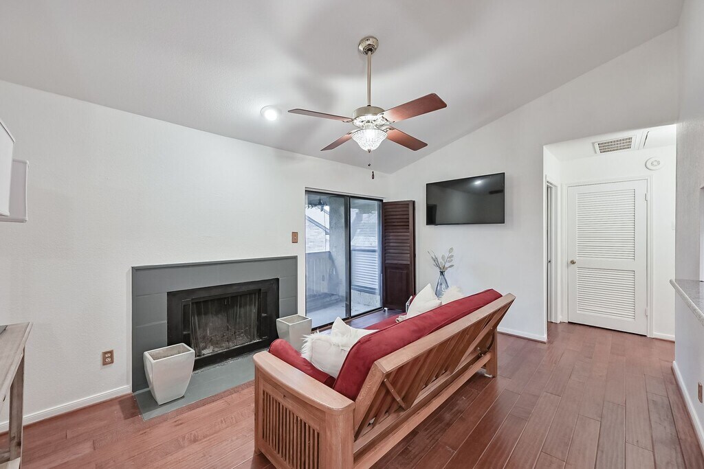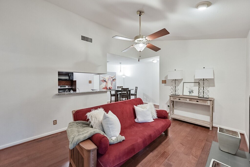 Highly coveted Cloisters condo that is well updated with Granite Counters and Stainless Steel appliances to include the fridge. Gorgeous wood floors throughout the home. New modern flush mount ceiling fan in the master bedroom. Mounted TV and mount stay. Updated tile shower and tub combo with dual sinks and updated fixtures in the bathroom. Plenty of room for the stacked washer and dryer unit that stays with the home as well. Private balcony with storage closet and extended range antenna for cost-free TV viewing. Gated community and Activity filled complex with 2 pools, 2 hot tubs, sauna, huge area for a cookout with guests, tennis courts, racquetball courts, fitness gym, and large clubhouse. 5 minutes to Globe Life Field, AT&T Stadium, SIx Flags, Hurricane Harbor and MUCH MORE!