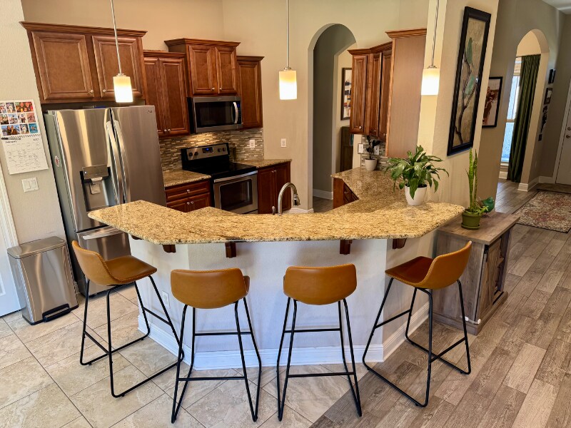 Property Id: 1771239 4 bed / 2 bath / 2 car garage home on a fenced half an acre. It features an open design with a large main living area boasting a tray ceiling with recessed lighting. The spacious kitchen has granite counters, tile backsplash, breakfast bar, dovetail drawers with soft close glides, and stainless steel refrigerator, range, microwave and dishwasher. The master suite features a walk-in closet, dual vanities, soaking tub, and tile shower with custom inset, ceiling rain head and glass surround! The kitchen, breakfast area, foyer, bathrooms and laundry room all have 18''x 18'' tile floors. This home has 4 large rooms, and each room includes a ceiling fan. Every window has custom blinds. The yard offers a covered patio to relax on. Come check out your next home! Less than 5 minutes to the beach, playgrounds, schools, post office, grocery stores, gas stations, restaurants, pharmacies, shops and more! 1 year lease Available to move-in on January 1st, 2026.