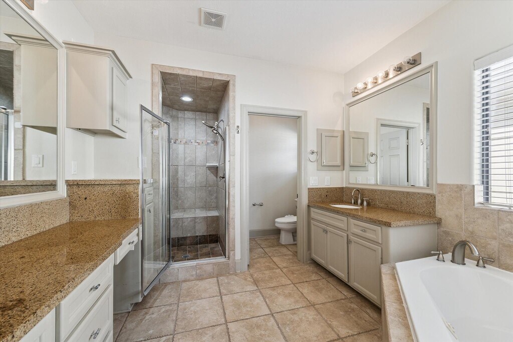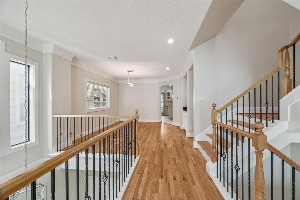 First-floor bedroom (or den) features new carpet,French doors to covered patio,wet bar,full bath,and walk-in closet. Main level offers oak hardwoods,sunken living room with built-ins,crown molding,and an open dining area with dry bar. The island kitchen includes stainless appliances,granite counters,and a breakfast area that opens to a deck with built-in seating—perfect for entertaining. Upstairs,the primary suite has a coffered ceiling,dual closets,and spacious bath. Secondary bedroom offers a private bath and built-in desk. Washer / Dryer Included. MLS# 45504616