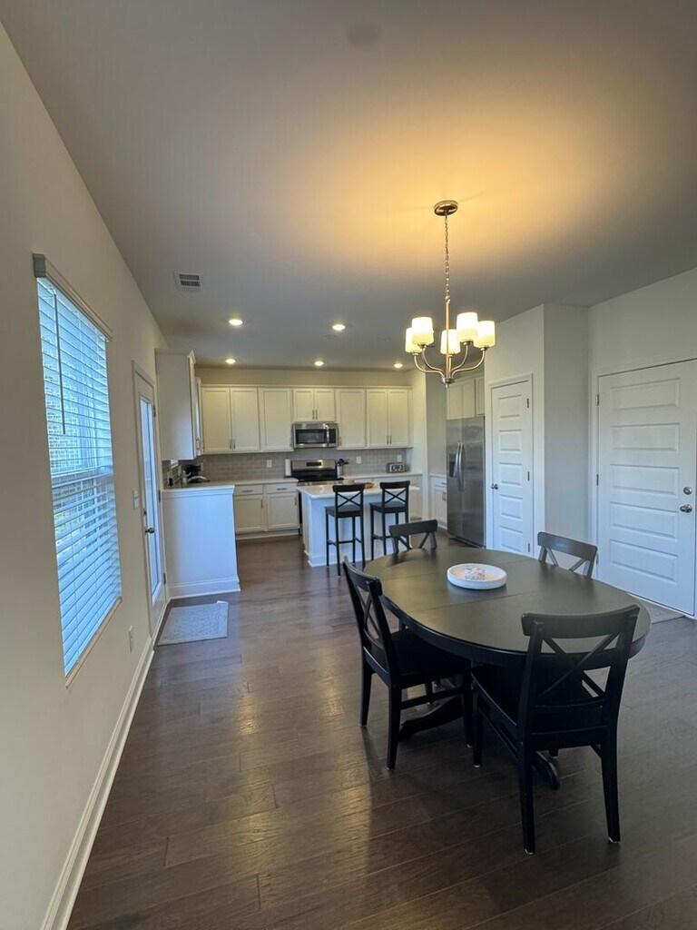 Welcome to this beautifully maintained, fully furnished single-family home located in an HOA community. Offering a two-car garage, this home delivers comfort, functionality, and convenience. The main level features a welcoming entryway and a first-floor guest bedroom with twin bed, end tables, and closet, along with a full bathroom with tub and shower. The spacious living room is filled with natural light from multiple large windows and comes furnished with a sofa, accent chairs, TV, and décor. The dining area flows seamlessly into the open kitchen, complete with an island, stainless steel appliances, coffee maker, toaster, and kitchenware. Upstairs, you’ll find a versatile loft/flex space with additional seating and TV. The primary suite features a king-size bed, sitting chair, walk-in closet with extra storage, and a private bath with soaking tub and large glass-enclosed walk-in shower. Two additional guest bedrooms include beds, dressers, end tables, wardrobes, and closets. A second full bathroom with single vanity and tub/shower combo, plus an upstairs laundry room with Maytag and Roper washer and dryer, complete the second level. Step outside to enjoy the backyard patio with seating, ideal for relaxing or entertaining. Lawn care and trash service are included in the lease, offering added convenience and reduced monthly maintenance responsibilities. Conveniently located just one block from a community playground, less than one mile from Hunters Lane High School, and approximately two miles from Cedar Hill Park, known for its excellent mountain biking trails. No pets allowed. Fully furnished and move-in ready.