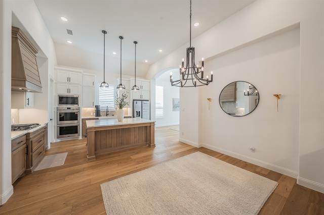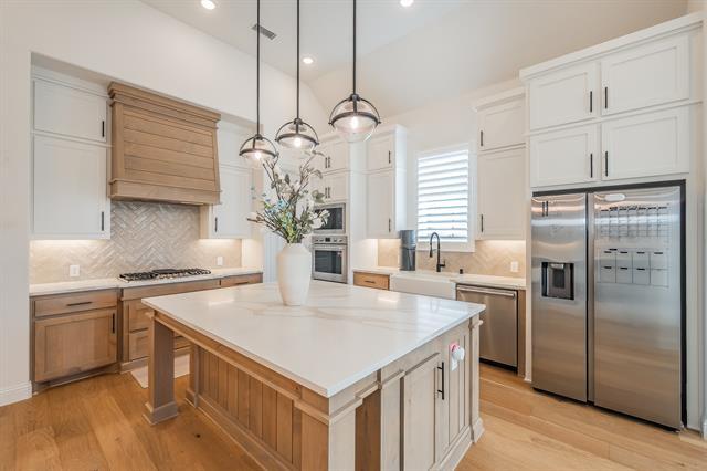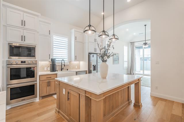 Gorgeous brick home built by renowned Highland Homes, ideally situated on a premium corner lot in the highly sought-after and award-winning Harvest community, zoned to top-rated Argyle ISD schools. This fully upgraded home welcomes you with a charming covered front porch and an upgraded front door with glass accents. Inside, enjoy light-colored hardwood floors throughout the living areas, kitchen, dining space, and primary bedroom. The spacious living room features soaring ceilings, abundant recessed lighting, plantation shutters, and wall-to-wall sliding glass doors that flood the space with natural light and create a seamless indoor-outdoor feel. The chef’s kitchen is truly a showstopper, offering an oversized island with storage, farmhouse ceramic sink, quartz countertops, 5-burner gas range, double ovens, a wine hutch with built-in cabinetry, large pantry, and extensive cabinet and drawer space throughout. Custom drapes add elegance throughout the home. Guest bedrooms are generously sized and include walk-in closets. The laundry room is thoughtfully designed with cabinetry and beautiful tile flooring, and a functional mud bench adds everyday convenience. Additional features include a tankless water heater and a 3-car tandem garage with epoxy flooring. Step outside to a huge covered back patio, perfect for relaxing or entertaining. Residents enjoy all that Harvest has to offer, including two resort-style pools, parks, a lake, walking trails, two fitness centers, community events, and more. This exceptional lease opportunity combines luxury finishes, thoughtful design, and an unbeatable community lifestyle.