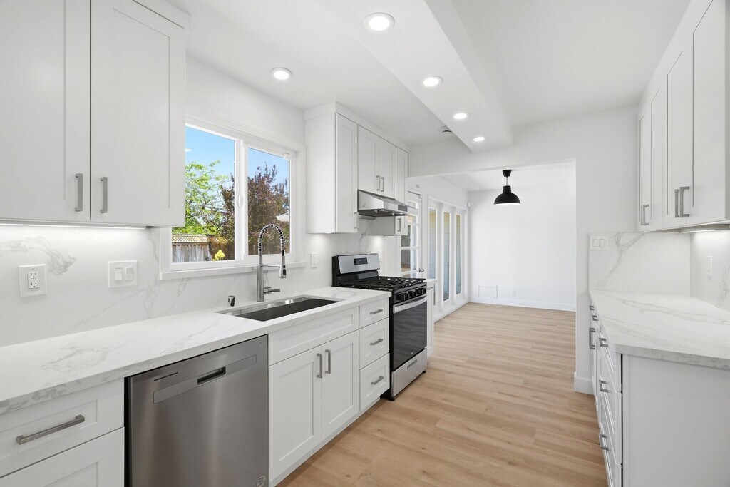Set on an expansive lot, this bright and inviting home offers soaring vaulted ceilings and an airy, open layout throughout. A charming paver walkway leads to the welcoming front entrance, highlighted by a striking arched transom window and multi-pane glass that sets the tone for the light-filled interior. Inside, clerestory windows, recessed lighting, and French doors flood the living spaces with natural light, while a cozy fireplace serves as a warm and inviting focal point. A picturesque bay window with built-in bench seating and track lighting adds both character and everyday functionality. The updated kitchen features crisp white shaker cabinetry, a stylish backsplash, and stainless steel appliances including a gas range with hood, dishwasher, and refrigerator. A convenient dry bar and dedicated laundry area enhance the home’s practical appeal. The bedrooms are bright and well-proportioned with ample closet space, including a spacious primary retreat complete with hardwood flooring, a rich wood accent wall, and sliding glass doors that open directly to the backyard. Designed for both relaxation and entertaining, the backyard showcases an expansive paver patio, mature landscaping, and a fully fenced yard for added privacy. A detached storage shed provides extra versatility, while the extended driveway offers plenty of parking. Situated in a highly desirable, top-rated school district, this home delivers an exceptional blend of space, comfort, and indoor-outdoor living. Applications available: