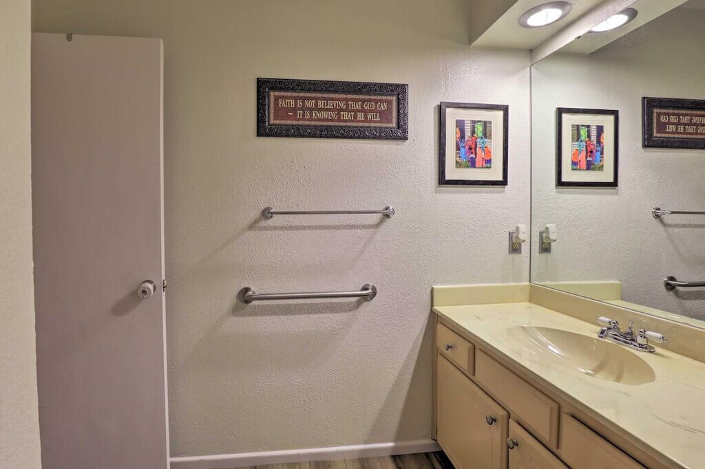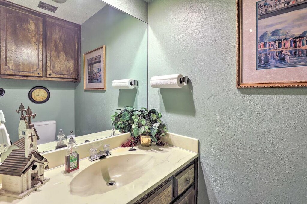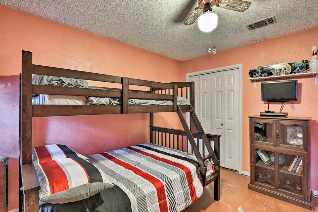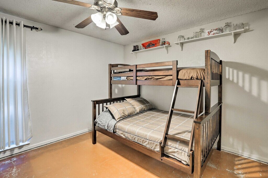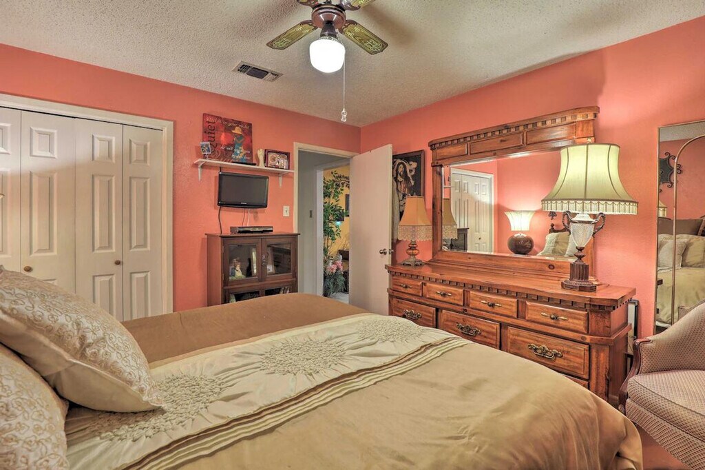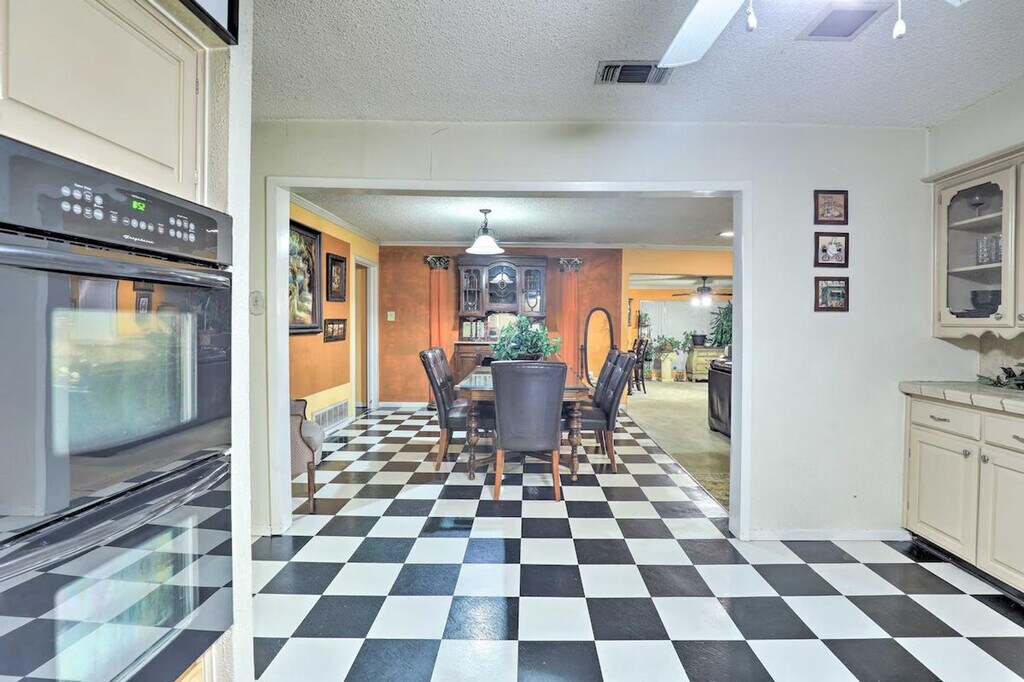 Feel at home in this centrally located 4-bedroom, 2.5-bathroom vacation rental in Arlington. This single-story home features step-free entry. This 2,500 sq ft home features 4 flat-screen cable TVs, a wood-burning fireplace, ceiling fans, a large dining table, and a laptop-friendly workspace. The kitchen is equipped with a dishwasher, microwave, coffee maker, blender, toaster, and dishware/flatware. You'll also have access to free Wi-Fi, A/C, linens/towels, and a washer/dryer. Pets are welcome with a fee of $150 (plus fees and taxes, 2 pets max). Centrally located between Dallas and Fort Worth, this home provides travelers with easy access to all the major sights and sounds of Texas. Spend your days riding roller coasters at Six Flags or visiting the animals at the Fort Worth Zoo, followed by evenings cheering on the Rangers and the Cowboys. AT&T Stadium is 9 miles away. Smoking, events, parties, and large gatherings are prohibited. Your safety matters. This property features a Ring doorbell camera on the front door facing the entryway. The camera does not look into any interior spaces. [SI]