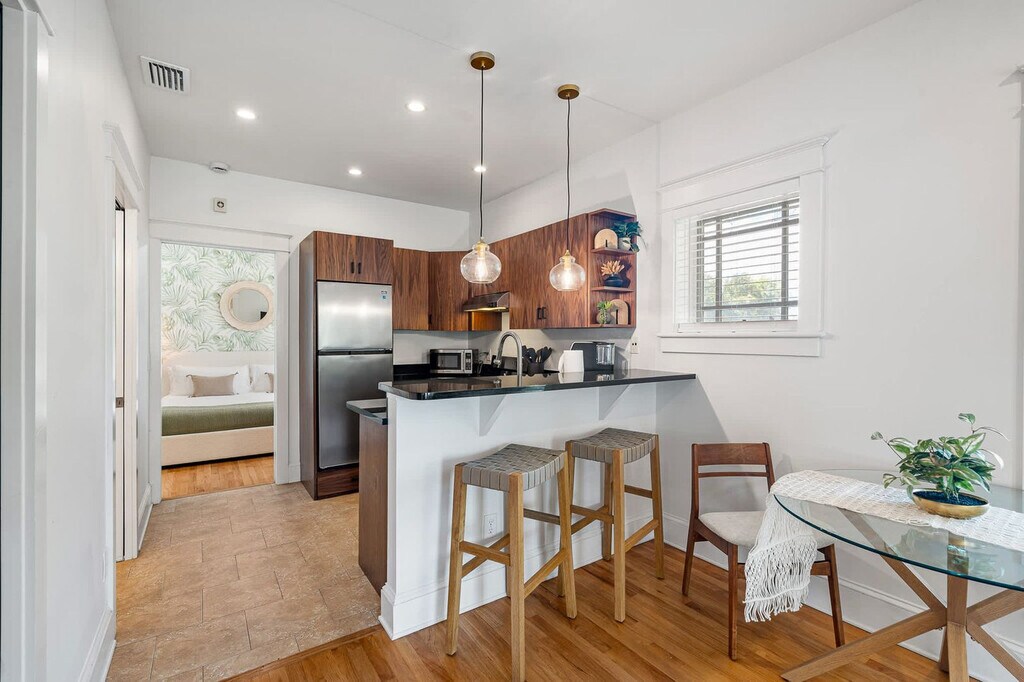 Tucked amongst the treetops is a charming, private apartment perfect for couples and solo travelers. Located on the second floor, access requires a walk up one flight of internal stairs. Feel at home with a 15-minute walk to downtown and less than a 10-minute drive to St. Augustine Beach. Enjoy proximity to local favorites like Osprey Tacos, Mellow Mushroom, and Llama. Welcome to Casita Tropical, a delightful apartment in the popular Davis Shores neighborhood. The apartment features a fully equipped kitchen with a coffee maker, pots, pans, plates, bowls, silverware, and glassware. It offers bar seating and a dining table for two, a king bed with a cozy memory foam mattress, a dresser and closet for clothing storage, an in-unit washer and dryer, and a full bathroom with a walk-in shower and fluffy white towels. Relax on the private balcony with a bistro set or enjoy the shared outdoor dining space with a gas grill. Ample free street parking is available directly in front of the building, although reserved parking is not provided. Casita Tropical is within short walking distance to downtown, allowing you to park your car and leave the keys at home. A trip to the beach is less than a 10-minute drive. Guests can use rideshare apps like Uber and Lyft or call a taxi, with cars available at all times of the day. Once in the city center, many of St. Augustine's shops, restaurants, art galleries, and attractions are easily accessible on foot. The Old Town Trolley Tours offer a fun way to see the city with a hop-on, hop-off service that makes 23 stops at popular destinations. Quiet hours are enforced between 10 p.m. and 8 a.m. per St. Johns County ordinance. The primary guest must be present for the duration of the stay, and any additional guests must be approved by the hosts prior to arrival. No parties, pets, smoking, or vaping are allowed on the property. Any evidence of smoking will result in an additional cleaning fee. Late check-outs and early check-ins require prior approval, and guests who stay past checkout time will be charged an additional fee of $100 per hour. A security camera is installed at the front door, and tampering with it may result in cancellation of the reservation. Follow all house rules and checkout procedures to avoid additional charges. [SI]