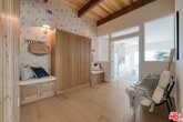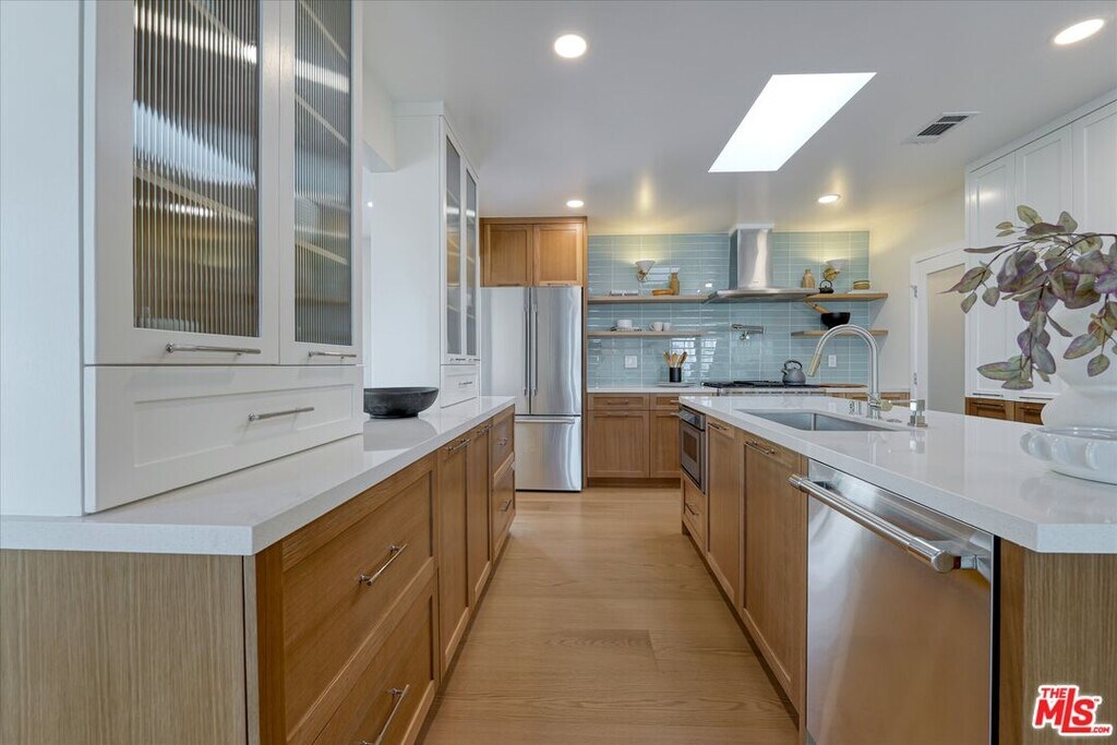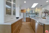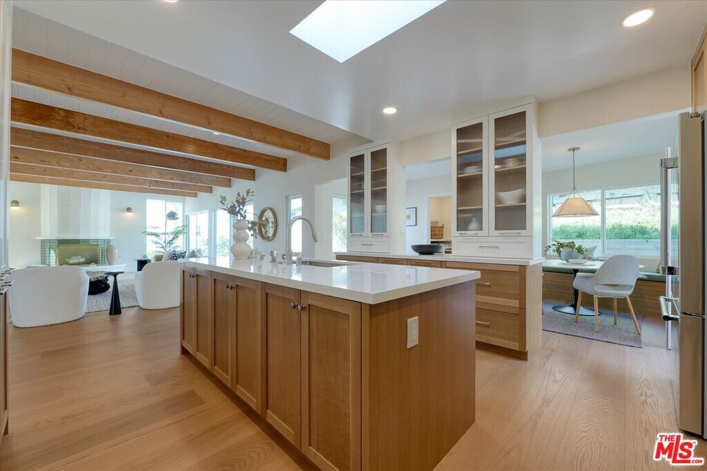 Complete, full remodel and reconfigured floor plan, down to the studs -this unfurnished 4 bedroom (+ 1 bonus room/bedroom) 4 bathroom one level home on corner lot with ocean views + pool and spa - is the ideal location in the Palisades - just off Sunset Blvd. and Pacific Coast Hwy., in the serene Castellammare neighborhood. Upon entering the oversized oak double doors, the formal entry welcomes you and sets the tone for sophisticated casual elegance with a curved wood wall mimicked by a Caesarstone surfboard" shaped counter - Crate & Barrel wall sconces and globe entry fixture. A special home with designer touches everywhere - chef's size custom large kitchen has endless storage - walk in pantry - large island including storage - and wall pantry. Premium stainless steel appliances by Thermador and Kucht brand (olive colored) professional gas range, skylight over island, adjoining breakfast and dining area with banquette - Large living space with custom white oak built-in cabinets and storage - original refreshed brick gas fireplace - full height new windows with sky and ocean views and convenient slider door opens to multiple entertaining areas - firepit overlooking the Pacific ocean. The primary suite includes large customized walk in closet & dressing area - spa ensuite bathroom, double vanity - oversized walk in steam shower with double shower heads + handheld sprayer. Another large bedroom has its own ensuite bathroom and custom closet organizers. The two middle bedrooms (one small, the other ample size) share a Jack-n-Jill bathroom with double vanity, shower over tub, mirrored doors and linen storage. A bonus room just off the living room doubles as an office or guest bedroom with 2 wardrobe closet cabinetry - glass French doors and slider door to outside. Separate laundry room has side by size washer dryer and storage cabinets. Throughout, you'll find European white oak wide plank hardwood floors, Walker Zanger & Zellige tiled bathrooms, dual heating/AC systems with nest thermostat, recessed lighting, new double pane windows, tankless water heater -two car private garage with EV charger and storage cabinets and 2 more parking spots in driveway, Ring Door Bell and so much more! Side yard has lounging areas + firepit, pool and separate spa overlooking beautiful Pacific ocean views - Everything in this home is brand new - be the first to enjoy this special one of a kind home!" MLS# 26642917
