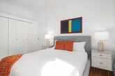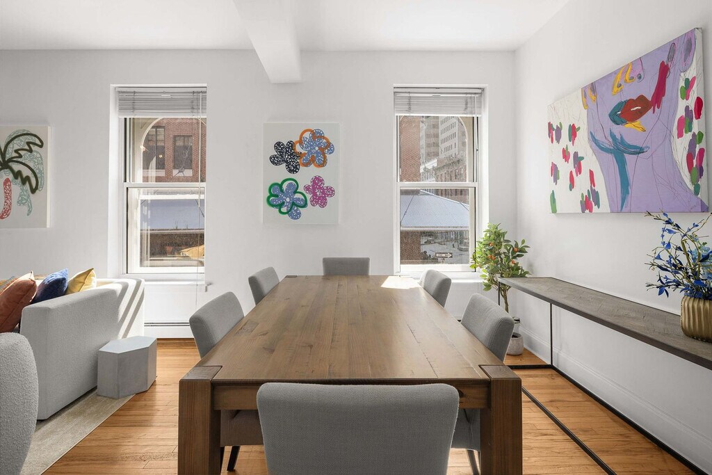 Tucked on a cobblestone street in historic Seaport, this floor-through loft features 10-foot ceilings, six oversized arched windows, exposed brick, and much more. Located inside a historic 1885 property designed by Architect George Post, this space offers a one-of-a-kind respite in the heart of downtown Manhattan. This unit is steps from cobblestone streets, tons of quaint eateries, the Jean George Tin Building, and the East River, all a half block away. Set within a boutique landmarked building designed by George Post, the architect of the New York Stock Exchange, this fully furnished 1-bedroom offers a truly exceptional living experience in the heart of downtown Manhattan. Six oversized windows drench the space with natural light, while 10-foot ceilings and original cast iron columns create a dramatic yet inviting backdrop. South and West exposures fill the loft with natural light throughout the day. Designer furniture and art round out the space, creating a truly unique living experience. The space's layout provides both comfort and versatility, with dedicated areas for lounging, entertaining, or working from home. The renovated kitchen features updated appliances, sleek cabinetry, and generous counter space, while the dedicated dining area provides seating for six. The bedroom features windows with South and West exposures, high ceilings, and space for a queen-size bed. Outfitted with hotel-quality linens and high-end mattresses, the space offers a quiet respite in the heart of the city. The renovated bathroom continues the modern updates with clean finishes and a spacious layout. Designed with both style and utility in mind, it complements the overall sense of comfort throughout the loft. Concierge service can coordinate cleanings, private events, and more. Able to schedule private chefs and excursions. Utilities for this unit are included in the listed price including Wi-Fi, electric, and heat. Excessive use of A/C exceeding $250 per month will be billed back to guests after move-out. Smoking is not allowed on the property. [SI]