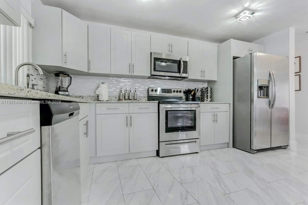 Where style meets comfort! This beautifully upgraded 3-bed, 2-bath single-family unit offers 1,351 sqft of stylish living space. Enjoy elegant porcelain tile flooring throughout and a sleek modern kitchen with wood cabinetry, granite countertops, and top-of-the-line appliances. The spacious master suite features a huge walk-in closet and a luxurious bath with dual sinks. Plus, enjoy the convenience of an in-unit laundry room with washer and dryer. Step outside to your own private pool — perfect for endless fun and relaxation! Located minutes from beaches, downtown, top-rated schools, shopping, and dining — with NO HOA! Tenants maintain the lawn and pool. Don't miss out — schedule your private tour today!