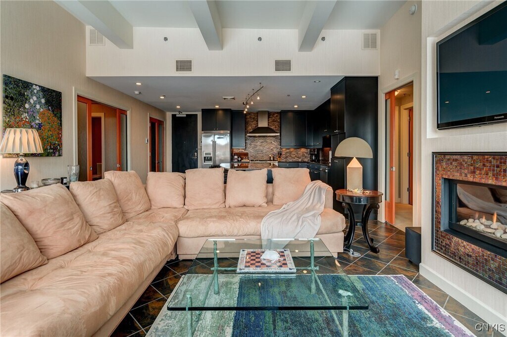 Experience Luxury Living in the Heart of Downtown Syracuse with this Stunning Fully Furnished Rental Condo in Jefferson Clinton Commons. Perched on the 4th Floor,this 1,600+ sq. ft. Unit Offers Breathtaking Views of Armory Square and Spectacular Sunsets through Floor-to-Ceiling Sliding Glass Doors. The Open-Concept Layout Features 2 Bedrooms,2 Full Baths,a Walkout Balcony,and a Cozy Gas Fireplace. The Chef’s Kitchen Boasts Granite Countertops,a Copper Backsplash,Custom Cabinetry,an Oversized Island,and High-End Viking Appliances. The Primary Suite includes a Spacious Walk-in Closet,an En-Suite Bath with a Walk-In Tile Shower,and a Bidet. The Second Bedroom offers Versatile Space,featuring a Built-in Murphy Bed and Room for a Workout Area,along with its Own En-Suite Bath. Enjoy Premium Amenities such as an In-Wall 6-Speaker Surround Sound System,Remote-Controlled Power Shades (including Blackout Shades in the Primary Suite),and a Top-Tier Security System. All Utilities,HOA Fees,access to a Private Fitness Center,Cable,WiFi etc all Included with Monthly Rent. The Building offers Secure Key Fob/Intercom Entry and an Secure Underground Parking Garage with 2 designated parking spaces. With Close Proximity to Restaurants,Shops,and Entertainment,this Luxury Rental immerses you in the Best of City Living. Don’t Miss the Opportunity to call this Exceptional Condo Home!