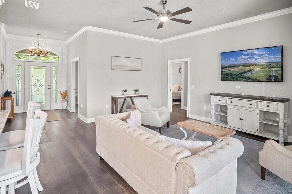 FULLY FURNISHED,you can enjoy this home with all the amenities it has to offer,from the moment you move in. This beautiful 3 bedroom,3 bath heated pool home boasts impeccable attention to detail. From the beautifully detailed kitchen cabinetry and gorgeous granite countertops,to the plantation shutters and crown molding. As soon as you enter the home you're greeted with an open floor plan and gorgeous French doors that highlight the paved patio and heated water pool. Complete with a waterfall feature,gas firepit,it's time to relax at your oasis. The master suite features tray ceilings in the bedroom,two walk-in closets,and an en-suite bathroom with dual sinks,and a large tiled walk-in shower. Upstairs provides a very cozy space including,reading area,workout area,with upstairs designated full bathroom. Large couch and TV give a cozy home theatre vibe,grab the popcorn. The location between Tampa and Orlando makes this the ideal spot for enjoying the best of Florida. Locally,the location provides a balance of proximity to nature,nearby shopping centers and excellent nearby schools. MLS# L4954808