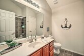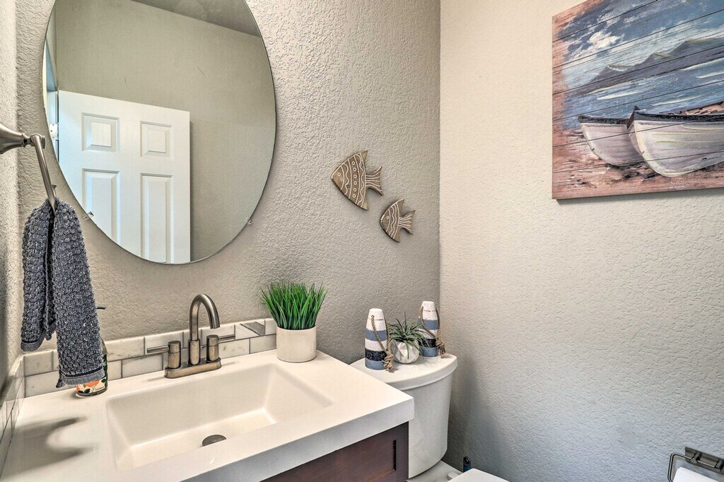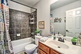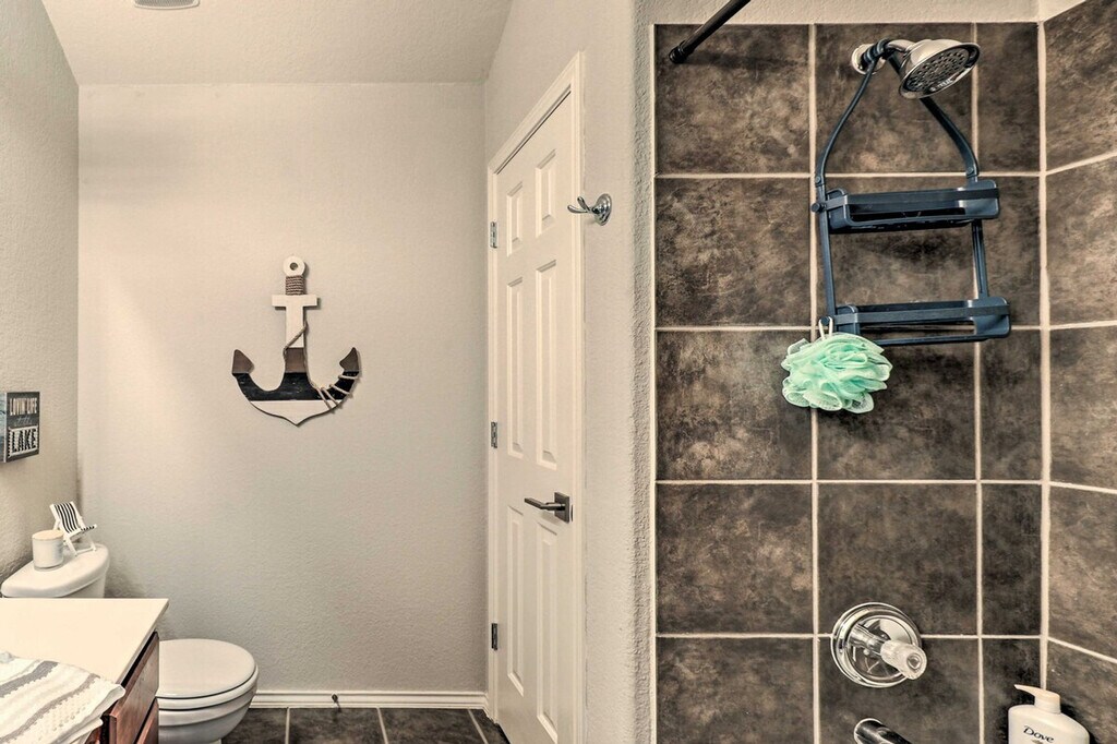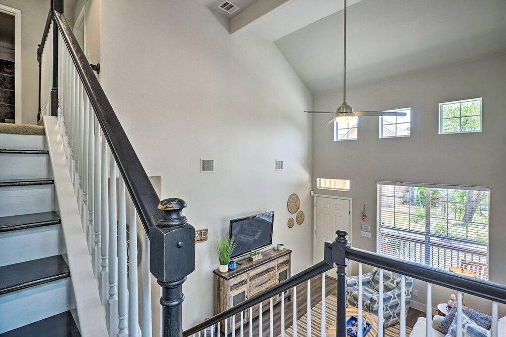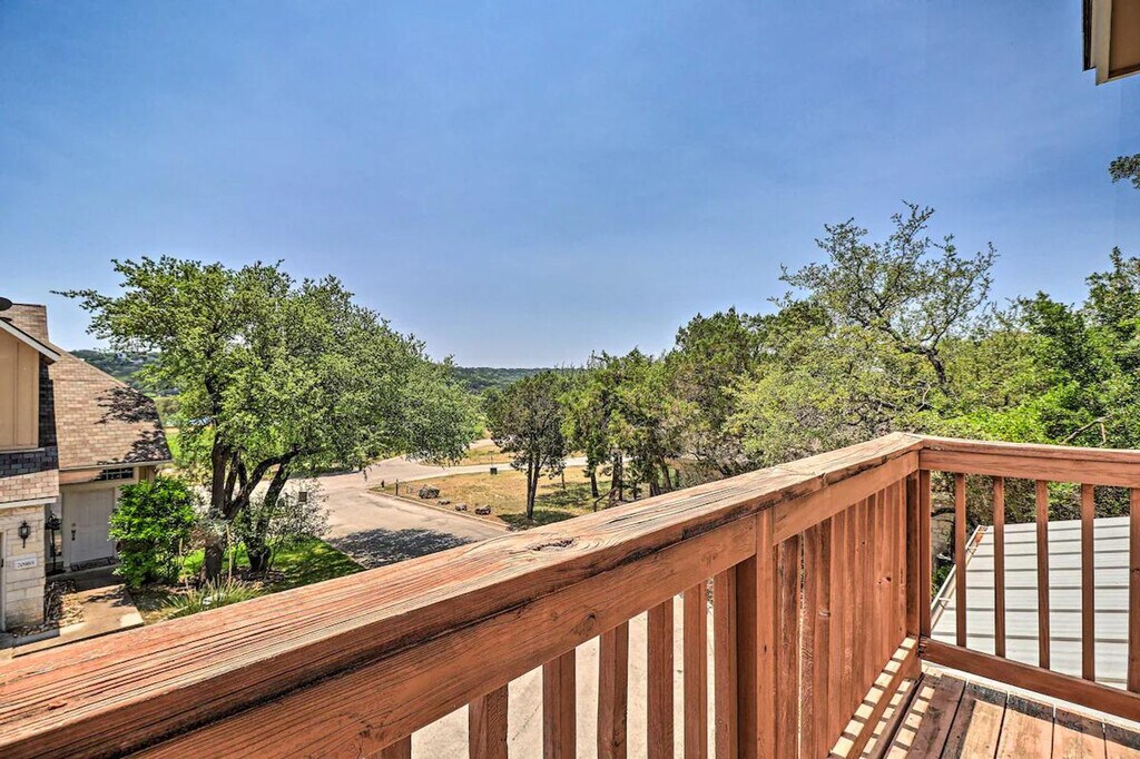 Feel at home in this Lago Vista townhome, offering year-round lake access and aquatic adventures. This 3-bedroom, 2.5-bath vacation rental offers 1,540 sq ft of living space. The kitchen is equipped with stainless steel appliances, an electric range, a microwave, a dishwasher, and a fridge with an ice maker. A drip coffee maker, dishware, flatware, and spices are also provided. Enjoy lake views from the balcony, and make use of the gas grill, fire pit, and yard space. Inside, you'll find smart TVs, lake decor, a dining table, ceiling fans, vinyl plank flooring, an open-concept layout, and an en-suite bathroom. A washer and dryer, towels, linens, complimentary toiletries, central air conditioning/heat, and keyless entry are included. This property is pet-friendly with a $75 fee for dogs only. Parking is available in the parking space next to the house for one vehicle, and street parking is also available. Guests have access to the community pool. This Austin area destination is the perfect place for families and groups to enjoy the great outdoors while sticking close to top attractions and eateries. Boat rentals are just a few blocks away, and Lake Travis is perfect for water sports. Access to the property is only by stairs. There are three external security cameras on the home's front, side, and back that actively record video while guests are in residence. A noise monitoring device is located inside the home in the main living area to alert the property owner of excessive noise levels. Guests not parked in designated parking areas are subject to tow. [SI]