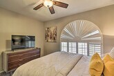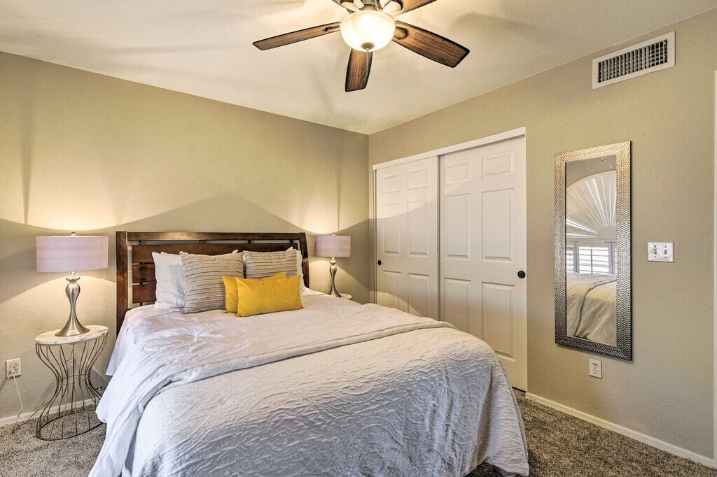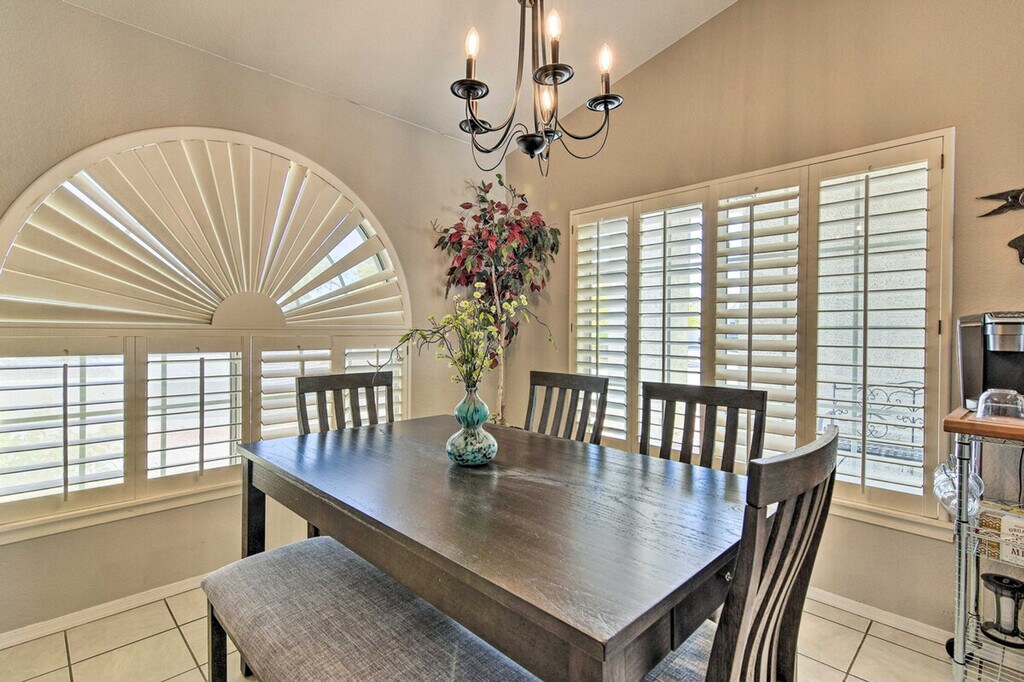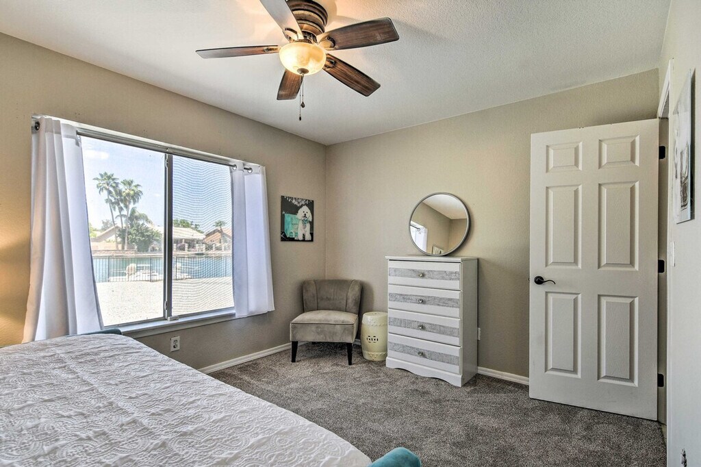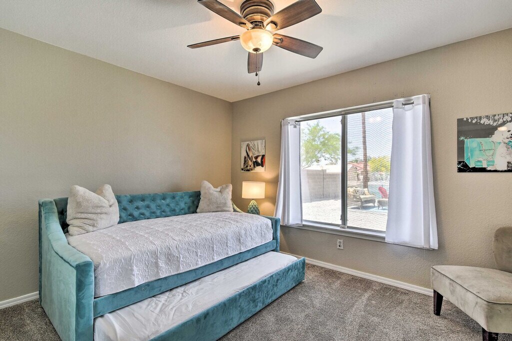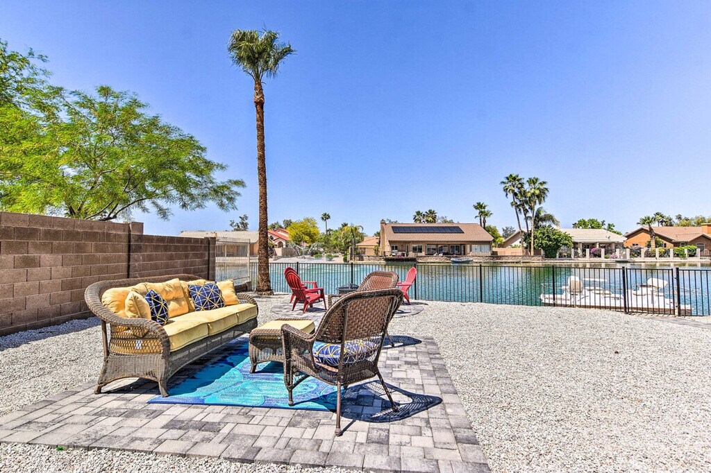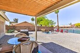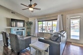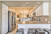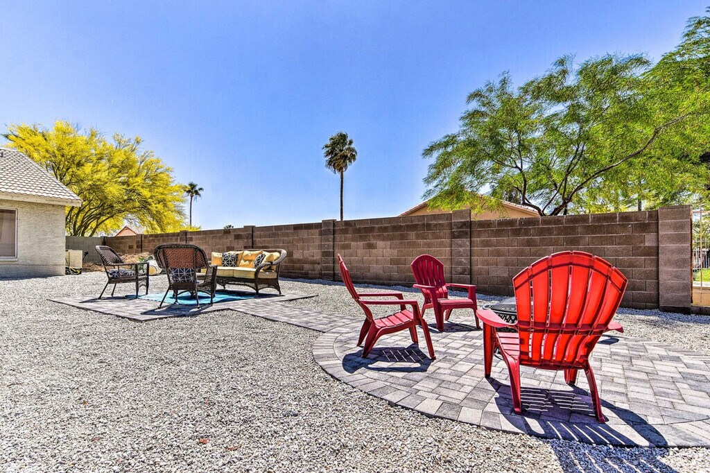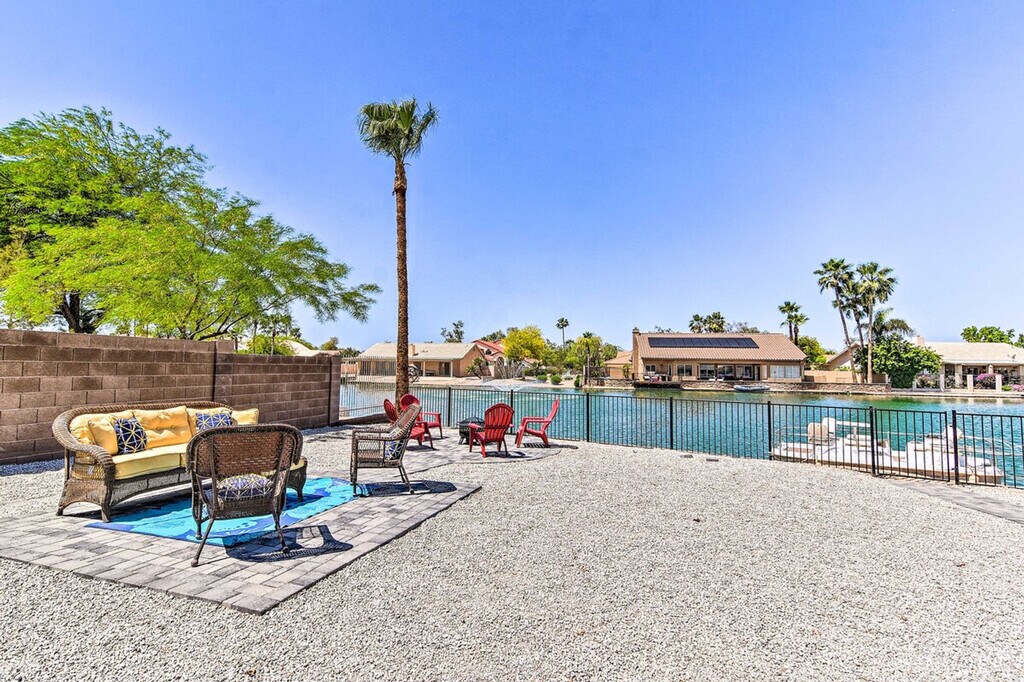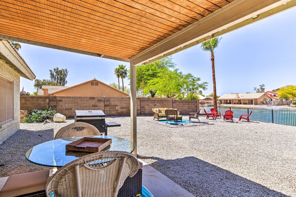 Feel at home in this Casa Grande home, the best place for your getaway. This home features 3 bedrooms and 2 bathrooms. This roomy home is fully stocked with families and friend groups in mind and features 2 Smart TVs with cable (cable available until April 1, 2024), an electric fireplace, a dining table, and ceiling fans. The fully equipped kitchen features stainless steel appliances, bar seating, a microwave, a coffee bar with a Keurig coffee maker and espresso machine, spices, a knife set, and cooking basics. Other amenities include free Wi-Fi, central air conditioning, a washer and dryer, linens and towels, and a hair dryer. This property is pet-friendly for dogs only, with a maximum of 2, for a fee of $75. Parking is available in the garage for 1 vehicle, in the driveway for 2 vehicles, and free street parking is available on a first-come, first-served basis. You'll be just a stone's throw from fluorescent fun at Casa Grande Neon Sign Park and historic encounters at Casa Grande Ruins National Monument. Enjoy outdoor entertainment areas with a fire pit with seating, lake views, a fenced-in backyard, a covered patio, and a charcoal grill. There is one small step to enter the property. This property features 2 exterior security cameras. Camera 1 is located on the front door facing the front yard and side of the house, and camera 2 is located above the gate facing the side of the house. The cameras are outward facing and do not look into interior spaces. The cameras record video and sound when activated by motion. [SI]