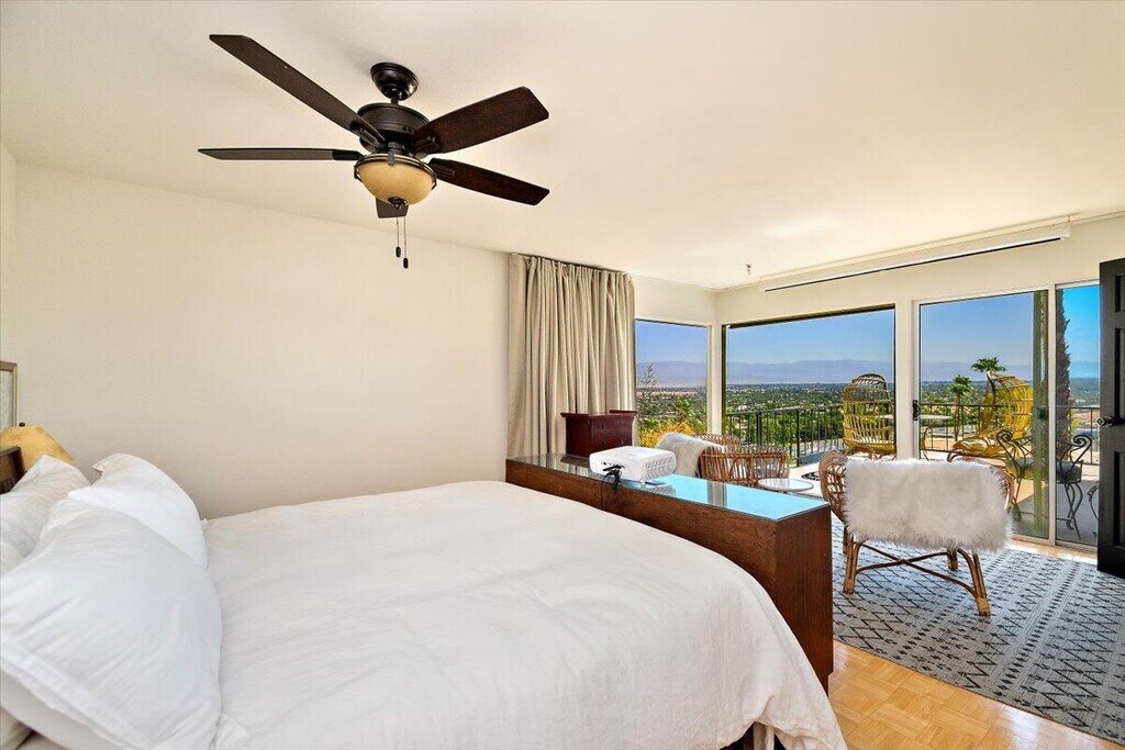 This condominium unit is located in the desirable area of South Palm Springs in Rim Crest Community. This 2 Bedroom 2 bath condo includes a full-sized dining area off the kitchen and living room that seats up to six people,a private patio with a magnificent view of Palm Springs,the kitchen is fully furnished with dishes,silverware,glassware,utensils,cookware,bakeware,microwave,gas stove. Double door fridge,12 bottle wine cooler and a number of small appliances,a Den or 3rd Bedroom with a Fireplace,master bedroom has a California King bed with walk-in closet & En Suite bath with a shower and double vanity,guest bedroom has a California King bed with a large closet with an adjacent bathroom,tub/shower combination. This is a one of kind unit don't wait Seller with Consider short term 3 months or more at $4000 a month
