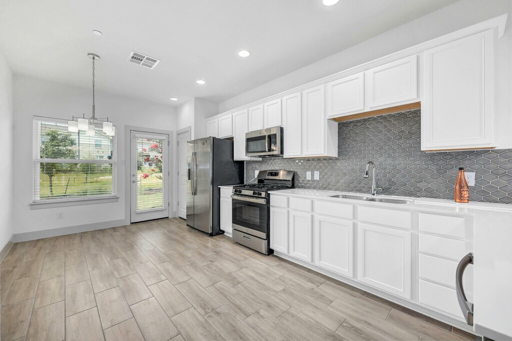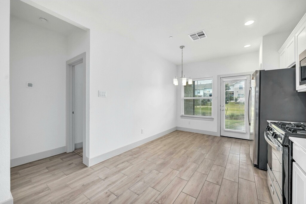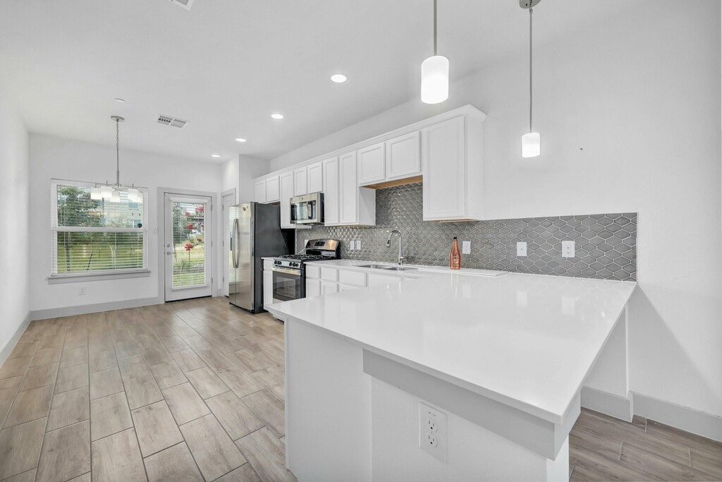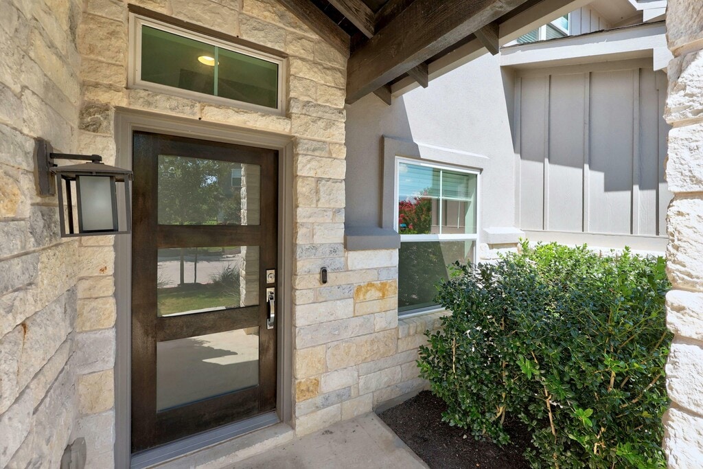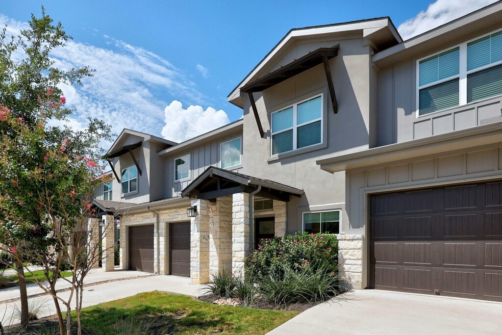 Step into this exquisite 3-bedroom, 2-bathroom condo where modern elegance meets comfort. As you enter, you're greeted by an abundance of natural light filtering through expansive windows, highlighting the high ceilings that amplify the sense of space and airiness.The kitchen boasts beautiful interior finishes with ample storage space including a pantry. A breakfast nook is included in the kitchen space and maximizes the space for entertaining parties of any size. The primary bedroom is located on the main level and offers a serene retreat with its own en-suite bathroom, providing privacy and convenience. The upper level houses two additional bedrooms with a bathroom upstairs. Outside, the condo presents beautiful curb appeal with tasteful landscaping and the convenience of an attached garage for convenient parking. Centrally located in Leander, this home is in close proximity to dining, shopping and entertainment. Commutes to Austin or the surrounding areas is possible with fast access to the 183 toll and 1431.