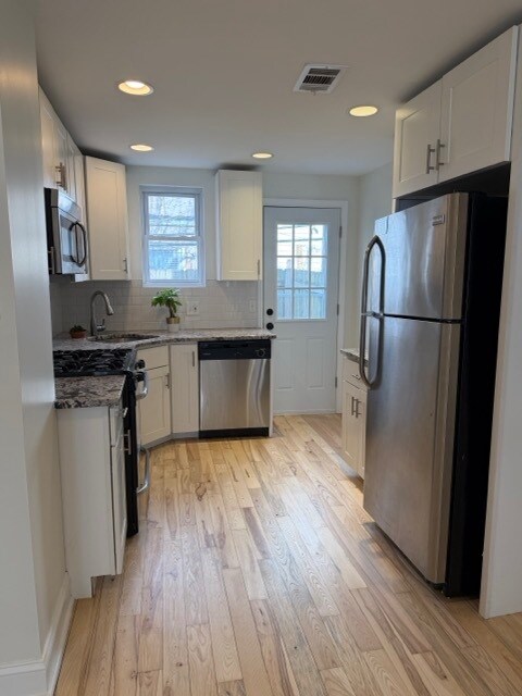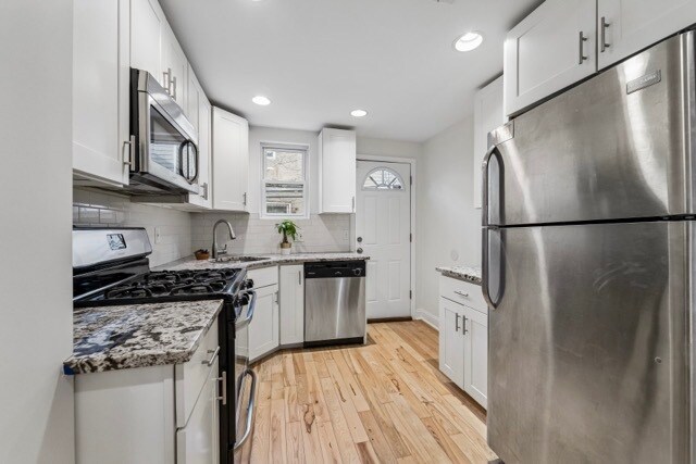 Beautifully updated two story home, gorgeous floors, lovely quiet one way street, ideal location with all the urban conveniences and transits. This home feels just right! Oh, out door space is waiting for your morning coffee or evening cocktail.....and basement is finished! Welcome to this beautifully updated two-story home in the heart of Point Breeze where modern comfort meets neighborhood energy. Step inside to sun-filled living and dining spaces with gleaming light hardwood floors and recessed lighting that make the home feel both warm and elevated. The open layout flows seamlessly into a stunning kitchen featuring soft-close cabinetry, granite countertops, stainless steel appliances, and a crisp white tile backsplash. A convenient first floor half bath adds extra ease for guests. Just off the kitchen, a private patio offers the perfect spot for morning coffee, container gardening, or hosting friends on a warm evening. Upstairs, you'll find two bedroomss, recessed lighting,...