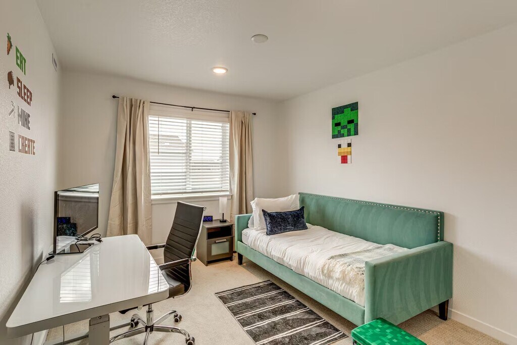 Welcome to this beautiful, newly built home at 21176 E 62nd Drive in Aurora, CO. With 2,069 square feet of living space, this modern 4-bedroom, 3.5-bath home offers plenty of room to spread out, whether you’re settling in long-term or hosting family and friends. The open layout brings the living room, dining area, and kitchen together, making the space feel bright and welcoming. Large windows let in tons of natural light, and the clean, modern finishes give the home a fresh feel. The kitchen is fully equipped with modern appliances, plenty of cabinet space, and a breakfast bar that’s great for casual meals or morning coffee. The primary bedroom is a comfortable retreat with its own private bathroom, while the additional bedrooms are flexible and well-sized—perfect for guests, a home office, or kids’ rooms. In total, the home includes four bedrooms with multiple sleeping options, plus three full bathrooms and a half bath for added convenience. This home is designed for both comfort and everyday living. You’ll find smart TVs, an electric fireplace, a dedicated workspace with a standing desk, and fun extras like a foosball table and arcade game. The backyard and furnished patio offer a nice spot to relax or enjoy time outside. Located in a convenient Aurora neighborhood, the home is close to parks, shopping, schools, Buckley Space Force Base, and has easy access to the airport and Denver attractions. This is a well-thought-out, move-in-ready home that blends modern style with practical living. A great opportunity in a location that makes life easy.