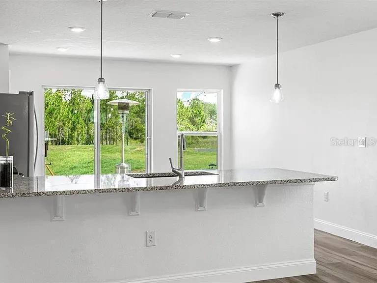This stunning single-family home is a true gem nestled in a charming and quaint neighborhood’s cul-de-sac. Featuring luxury vinyl floors NO CARPET anywhere in the house. Solid wood white cabinets adorned with stainless steel hardware,and granite counter tops. The open and airy layout is complemented by recessed lighting and an abundance of natural light from the modern light fixtures. The kitchen is a chef's delight,complete with a stainless steel refrigerator,ample eating-in area,and contemporary design elements. The bathrooms are equally impressive with sleek glass showers. Freshly painted interiors add to the home's pristine condition. A highlight of this property is the very nice back patio,offering serene views with no neighbors behind,providing ultimate privacy. This home also includes a washer and dryer in its own room,not in the garage for added convenience. Ample 2 spot car garage. The metered sprinkler system will keep your yard green and beautiful. Perfect for those seeking comfort and style in a picturesque setting,this home combines modern living with a touch of tranquility Less than a mile from Davenport High school and Davenport School of the Arts. Only 30 mins from Walt Disney World. Schedule your private tour today. MLS# O6380673