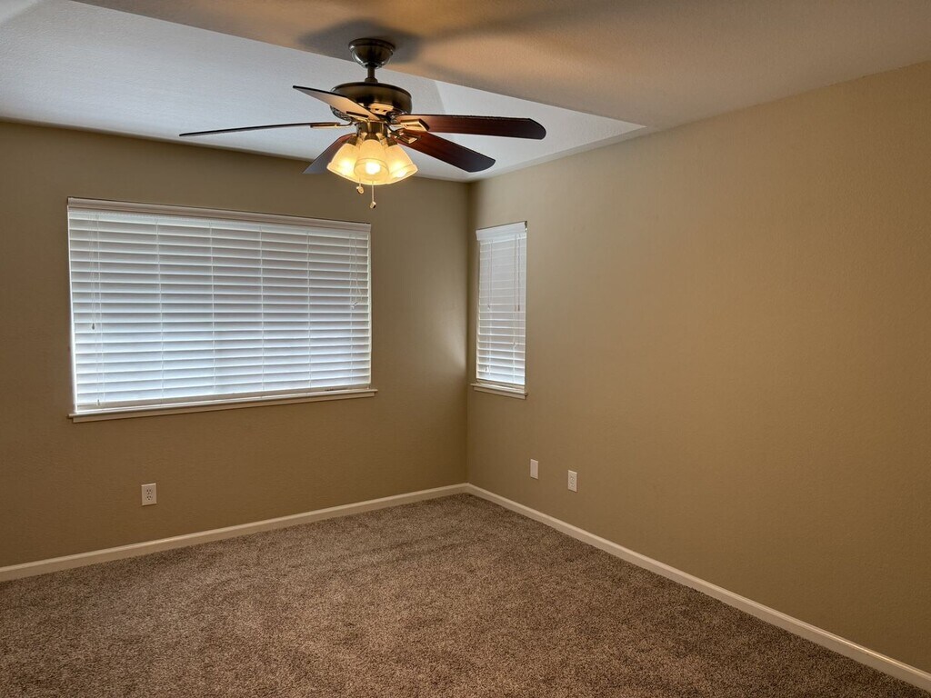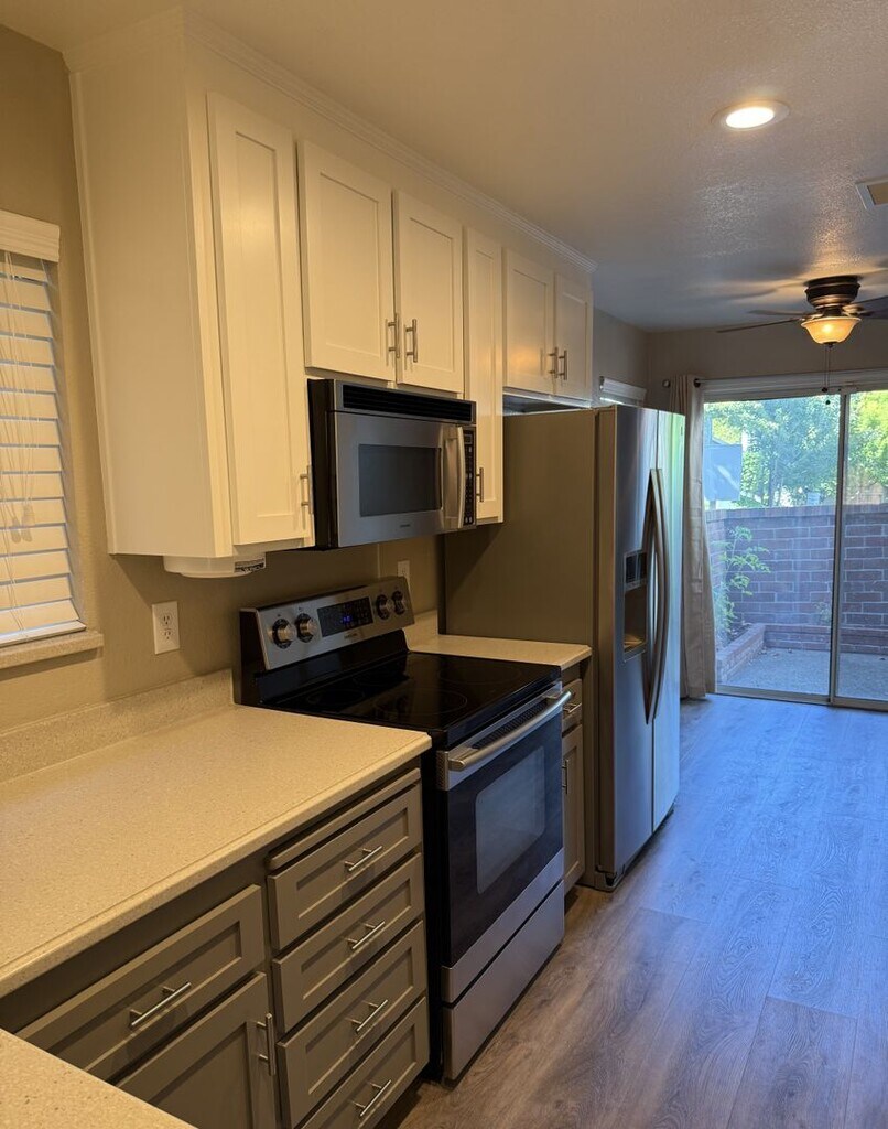 Welcome to this spacious and tastefully updated 3-bedroom, 2.5-bath condo offering 1,382 square feet of comfortable living space. Built in 1990 and meticulously maintained, this home features modern upgrades and thoughtful touches throughout. Step inside to an inviting open layout with new luxury vinyl plank flooring downstairs and a recently installed gas fireplace insert with updated tile surround—perfect for cozy evenings. The kitchen has been beautifully updated with refreshed cabinets, stainless steel appliances, and a new dishwasher. A Nest smart thermostat, along with a security system, adds to the home’s modern comfort and peace of mind. The spacious primary suite includes a ceiling fan, double vanity, and access to abundant natural light. Ceiling fans are also found in the guest bedroom and breakfast nook for added comfort. Enjoy both a private front patio and a serene rear deck—recently upgraded with new framing and boards—ideal for relaxing or entertaining. Additional highlights include: Small Dog allowed Attached single-car garage with overhead storage Level 1 charger in the garage for electric vehicle Central heating and air (AC and furnace serviced annually) Water heater replaced in 2022 Updated upstairs linen cabinets Replaced water pressure regulator Community amenities include access to a sparkling swimming pool, hot tub, fitness center, and a multi-purpose room. Located close to parks, shopping, and with easy freeway access, this home blends convenience, comfort, and lifestyle. Included appliances: Refrigerator, microwave range, dishwasher, garbage disposal, washer, dryer, gas fireplace insert, and Nest thermostat. Don’t miss the opportunity to rent this move-in ready gem with a perfect blend of style and function!