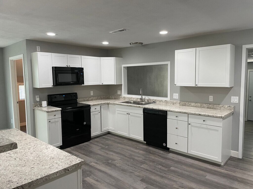 What a gem! Walking in the front door you are welcomed by the large living area! 2 Bedrooms (opposite of each other) with main bath. The Master Suite is in the back of the home with more privacy! Private bathroom featuring double vanity sink, walk-in master closet. The Kitchen flows into the second living area. Great natural lighting throughout and so spacious! Kitchen features - all black appliances - breakfast bar - pantry - dining nook - plenty of countertop space + storage Laundry room with w/d hookups off of kitchen! The Backyard is completely fenced (chain-link) with a patio, great space for entertaining! Pet Friendly
