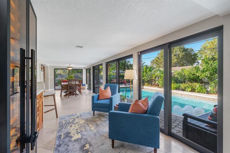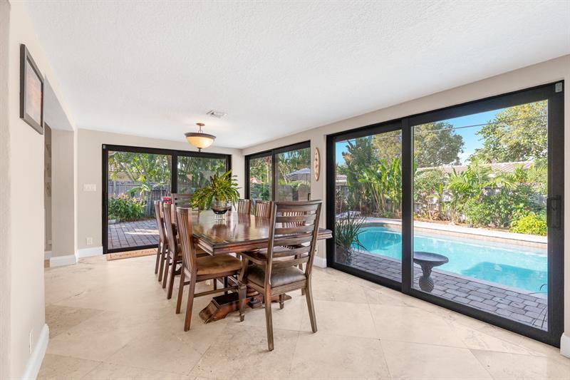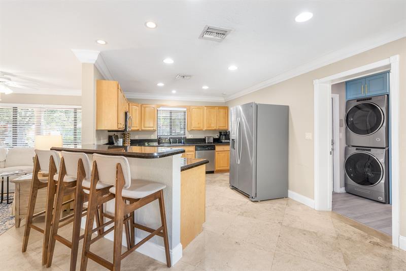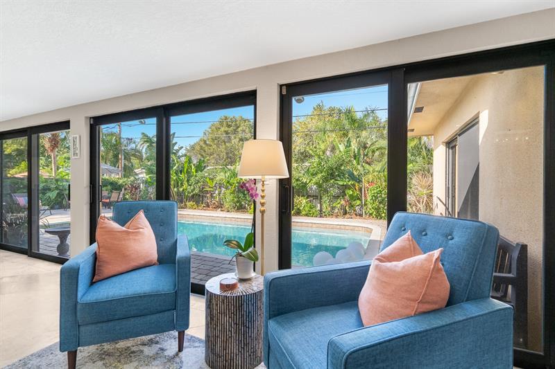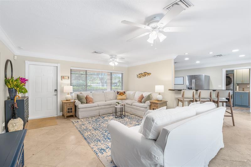 Move In Ready! Fully Furnished home beautifully decorated with 3 spacious bedrooms. Main suit has king size bed and all other bedrooms have queen beds. 2 Full bathrooms and 1 half bath for guests. Covered porch to enjoy your morning coffee or evening cocktail, backyard with lush landscaping, patio setting and sparkling pool. This home features a custom bar and laundry room with built in cabinetry for extra storage. Large living area and open kitchen with snack counter and tons of natural light. One car garage for a car and storage. Quiet upscale neighborhood with close proximity to shopping, dining entertainment and Lighthouse Point Marina & beach area blocks away.