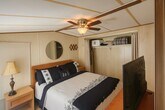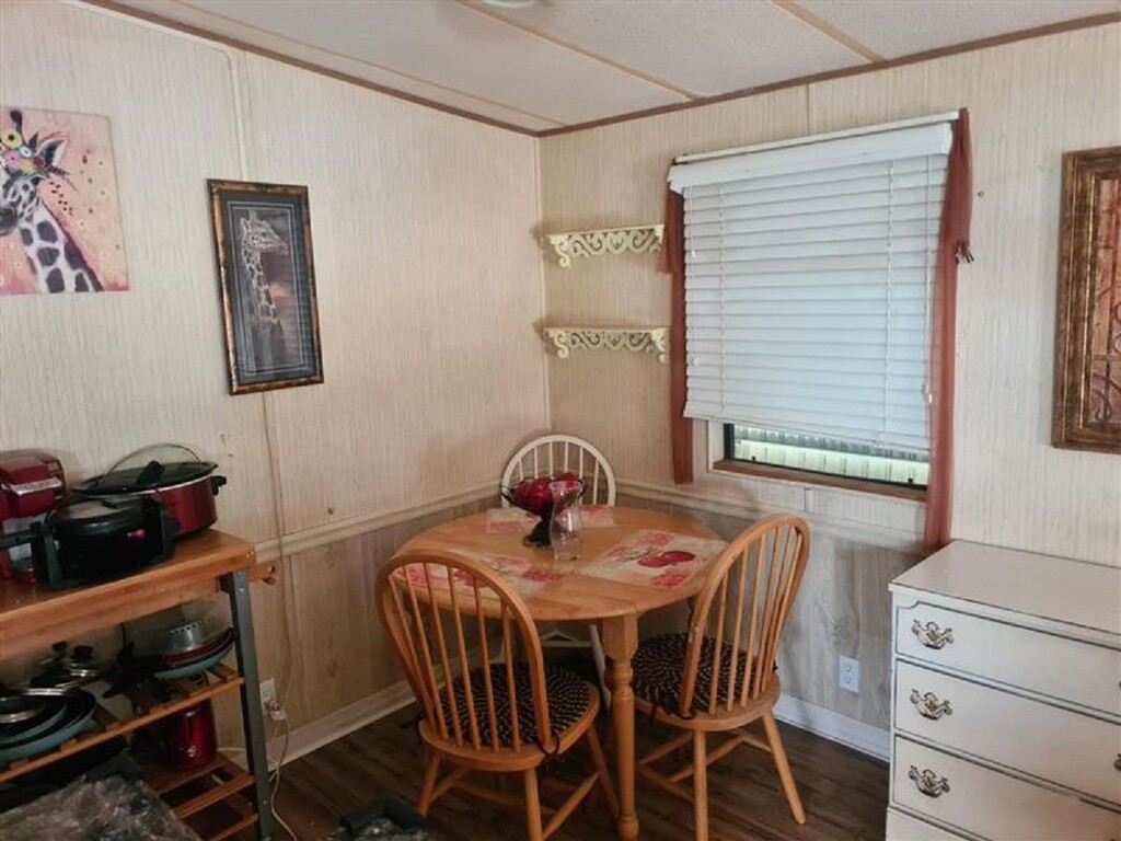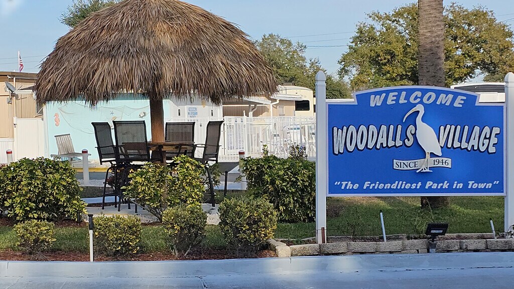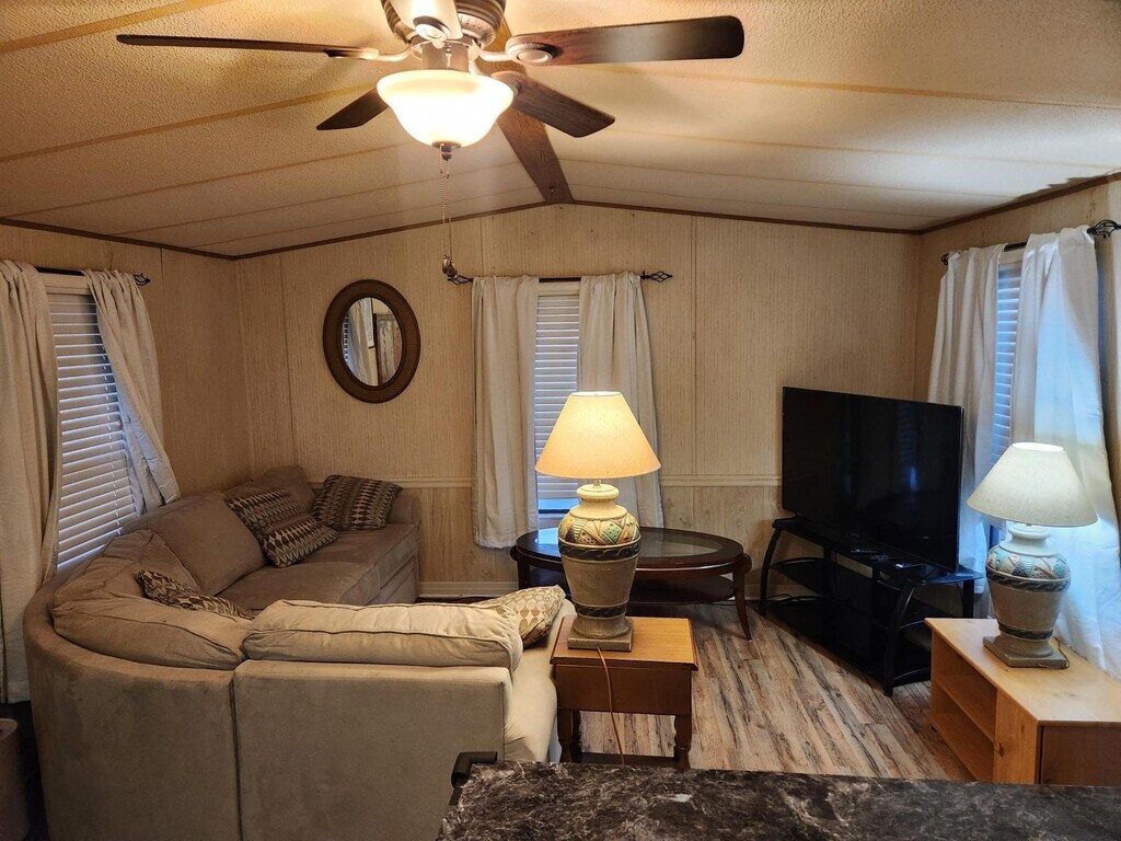 Located in a gated 55+ retirement community, this charming 1-bedroom manufactured home includes a golf cart and everything you need for a comfortable short or long-term stay. This lovely 720 sq. ft. home features a spacious living room with a sectional couch, coffee table, and 55" smart TV. The updated kitchen is fully equipped with a full-size French door refrigerator, baking/convection oven, microwave, toaster, blender, bread maker, coffee maker, and an attached dining area with table. The bedroom includes a comfortable queen bed, dresser, a closet, and a 32" smart TV. The bathroom features an easy step-in shower with a low entry, a flexible shower head with great water pressure, a recently replaced toilet, large mirrors, and a hair dryer. For guests who work remotely, the home includes a dedicated workstation with an adjustable height desk, reading light, universal docking station, 27" monitor, and wireless keyboard and mouse, perfect for productivity and extended stays. The home also features a HEPA air filtration system for cleaner, fresher air throughout your stay. A covered porch offers a relaxing outdoor space with a patio set and BBQ grill, and it connects to a storage area with a washer/dryer combo. Conveniently located in Woodall's Village in Lakeland, you’ll be close to CVS Pharmacy, Save A Lot grocery store, Subway, Lakeland Regional Hospital, and more. The community offers a heated pool, plus a clubhouse, shuffleboard courts, and other organized activities, perfect for staying active and social. Professionally cleaned between stays. Please reach out with any questions or for more details. Discounts available for long-term stays.