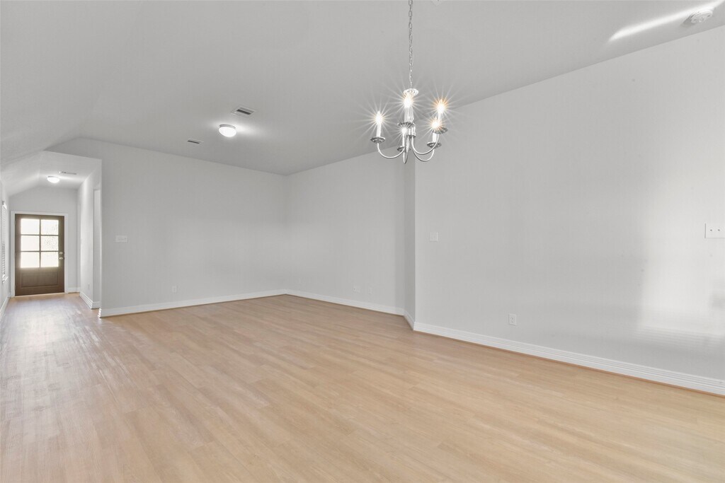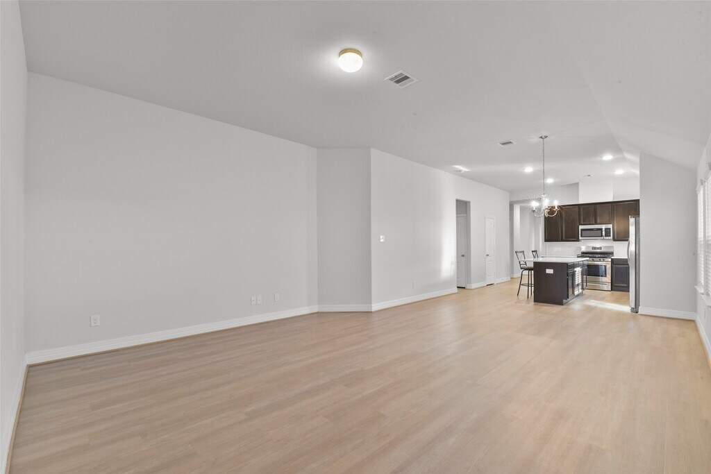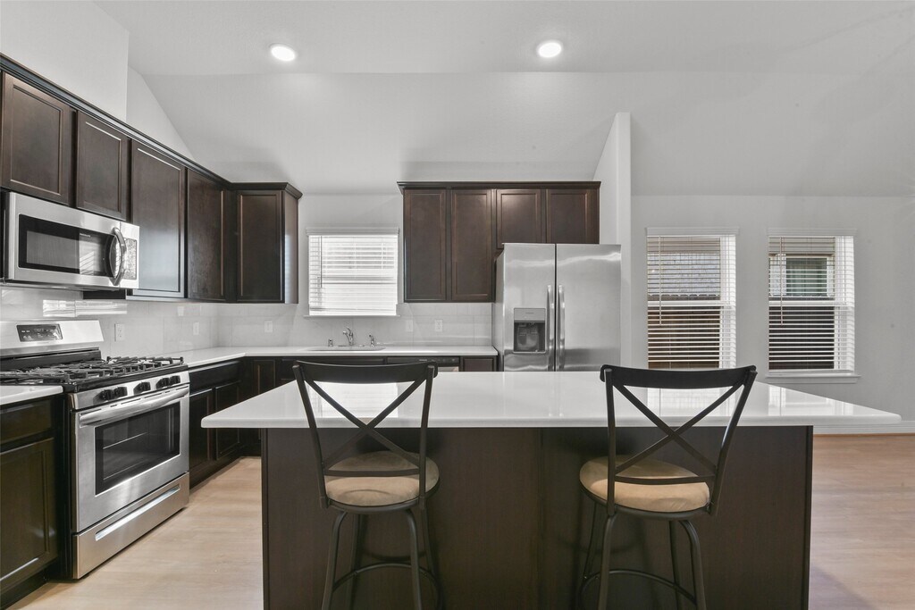 Beautiful 1-story,4-bedroom,2-bath home with a pocket office and high ceilings throughout. Features include luxury vinyl plank flooring in the family room,dining,utility,and all wet areas,with carpet in bedrooms. The kitchen offers quartz countertops with a large island,marble-like tile backsplash,42” upper cabinets,and stainless steel appliances including a microwave,range,and dishwasher. The primary bath features dual vanities,and the secondary bath also includes double sinks. Additional highlights include 2” blinds,upgraded trim,a 3-lite glass front door,garage door opener,covered patio,and a beautiful stone elevation. ENERGY STAR® Certified for added efficiency. MLS# 76961814