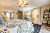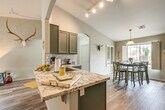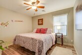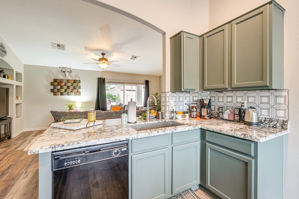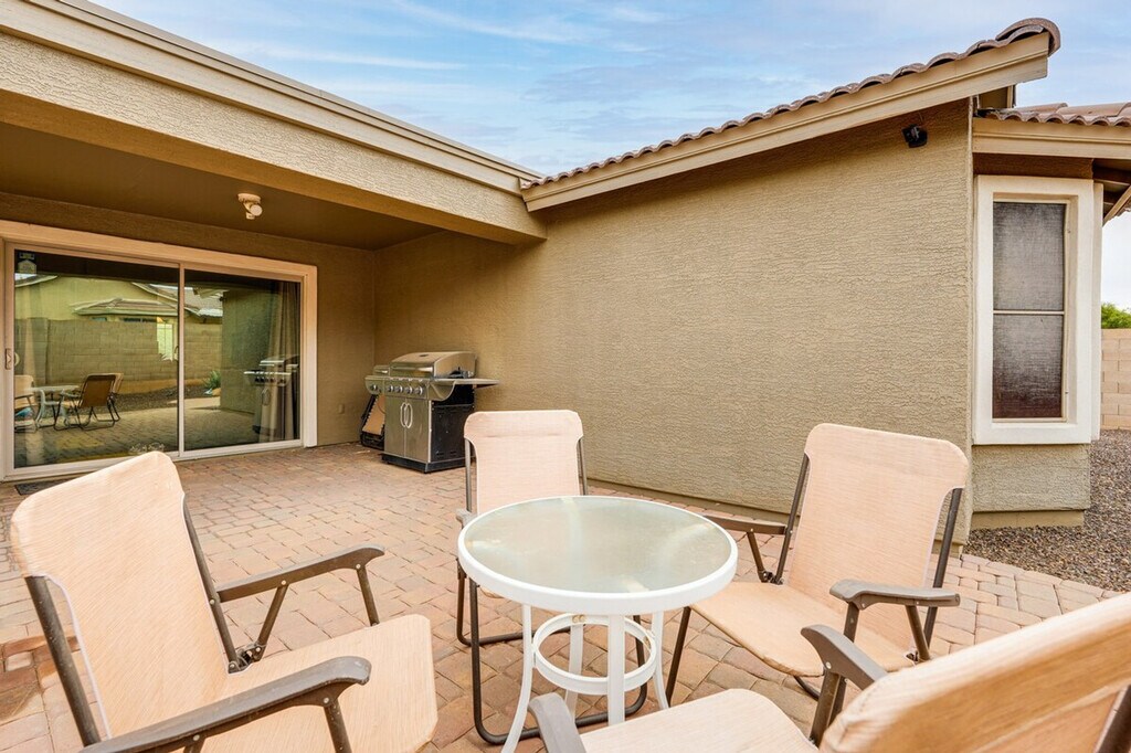 Feel at home in this sun-drenched San Tan Valley vacation rental, a peaceful launching pad for your extended retreat. This 3-bed, 2-bath home requires 1 exterior step to enter. This home features a smart TV, laminate and wood flooring throughout, a soaker tub, and a dining table. The kitchen is equipped with a refrigerator, stove/oven, dishwasher, drip and French press coffee makers with starter coffee provided, blender, toaster, microwave, Crockpot, cooking basics, dishware and flatware, spices, and a knife block and coffee grinder. You'll also find a washer, dryer, laundry detergent, iron and board, linens and towels, complimentary toiletries, a hair dryer, and hangers. Driveway parking is available for 2 vehicles. The garage is not available. Surrounded by scenic desert, this apartment is located within a short commute of local medical centers, with easy access to hiking and shopping. Start your days among saguaros and end them stargazing on the partially covered brick patio with outdoor seating and a gas grill in the fenced backyard. No smoking or vaping, events, parties, or large gatherings are allowed. Additional fees and taxes may apply. A photo ID may be required upon check-in. The property manager lives next door in a completely separate unit and may be present during your stay. This property features 2 exterior security cameras that are outward facing and do not look into any interior spaces. Camera 1 is a Ring doorbell on the front door facing the front entry, and camera 2 is located on the roof facing the front entry. The cameras record video and audio when motion is detected. No pets are allowed. [SI]