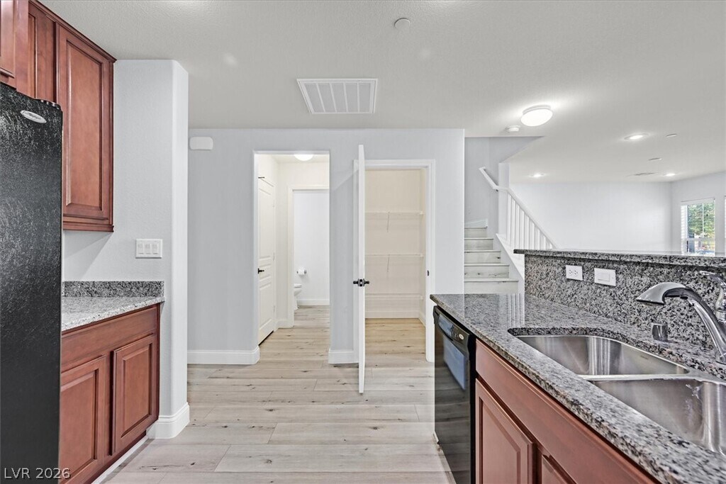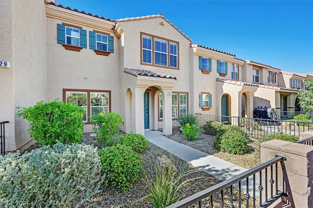 Adorable townhome in Inspirada with inviting gated courtyard. Two primary suites with full baths and walk in closets. Separate laundry room. All vinyl flooring throughout home. Black appliances. Granite countertops. Breakfast bar open to living room. Perfect area in Inspirada near parks and walking trails.