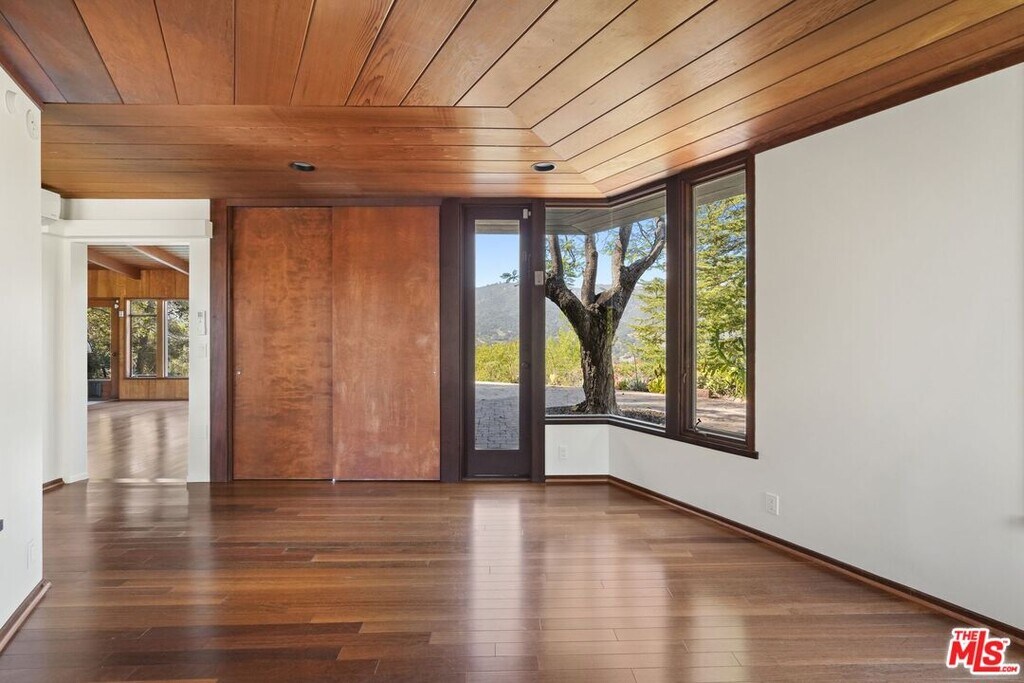 Original Mid-Century Architectural Topanga Pool Home with expansive views by architect Bob Bates. Perched high above the canyon on a serene knoll in the coveted Pos Office Tract, this original Mid-Century architectural home stands as a luminous ode to Topanga's artistic spirit. The essence of Frank Lloyd Wright's Honeycomb House lives on here. Tucked up a private driveway that meanders beside the State Park, the property opens to a world of quiet grandeur, a landscape of golden light, rustling oaks, and boundless vistas that seem to float between earth and sky. Here, architecture and nature entwine in a lyrical balance, every beam and pane of glass choreographing the movement of sunlight across redwood walls, wood floors, and polished stone floors. Inside, the home unfolds with the understated drama of true mid-century design, post-and-beam vaulted ceilings, crisp white walls, and generous expanses of glass that dissolve the boundary between indoors and out. The living room, centered around its original, rugged stone, wood-burning fireplace, feels suspended in air, gazing out over the lap pool and hot tub to views that stretch toward the horizon. Daylight glimmers on the water's surface before spilling into the home, where every space is tuned to the rhythm of the canyon beyond. A spacious hexagonal room, enwrapped in views, sits near the living room. It could live as a media room, playroom, dining room, or office! The reimagined kitchen, a study in serenity, marries warm red oak floating shelves with sleek modern appliances. Thoughtful details, from filtered hot water for tea to chilled water dispensers at hand, invite ease and quiet luxury into daily rituals. Each of the four bedrooms offers its own connection to the outdoors, French doors that open to the pool, upper decks framed by branches, a view softened by light, while two elegant bathrooms echo the home's natural palette. The larger upstairs bedroom is a special aerie, with frameless corner windows, dazzled by park and mountain views. A separate renovated laundry room, complete with a 3/4 bathroom, extends the possibilities of the property, making for an ideal artist's studio, or workspace for creative pursuits. Every corner invites inspiration, every window a canvas for the changing sky. Beyond the walls, the acre of land is alive with abundance. Mature oaks, jacarandas, and olive trees mingle with lemon, lime, kumquat, and mandarin, a living tapestry that perfumes the air. The garden terraces, framed by native succulents and stone, open to sweeping canyon and mountain views that shift with the light, transforming from silver morning haze to molten sunsets. There is room for a garden, outdoor entertaining areas, and parking for 10 vehicles, including a 2 car garage. This is a home that breathes, expansive, soulful, and deeply connected to its surroundings. At once architectural and organic, refined yet elemental, it embodies the essence of Topanga living: artful, private, and bathed in the glow of California's natural beauty. Here, the architecture doesn't merely shelter you, it reminds you to look up, listen closely, and live in rhythm with the land. There is a trail into Topanga State Park next to the driveway. The mid-canyon location is near all Topanga has to offer, with charming shops, cafes, galleries, pilates studios, and cultural landmarks, and is 15 minutes to the beach. The acre property is bountiful and a very special setting in the canyon, with a home that breathes with light and inspired architecture. You could live in this stunning work of art. MLS# 25617077