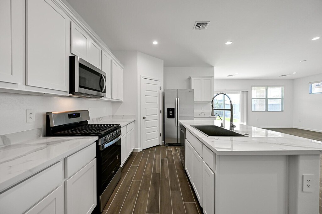 A FANTASTIC home in the beautiful new Radiance Community! This is a lovely 4 bed 3 FULL bath home! Enter into a long hallway w/ 2 generous size bedrooms & full bath. Continue on to a large den & 3rd bedroom & 2nd full bath. The expansive open concept living/dining space welcomes you in with lots of natural light and fresh contemporary finishes. Fantastic kitchen w/ a large island,pantry,gas cooking and SS appliances. Primary suite is spacious & inviting w/ a beautiful en-suite bath & large walk-in closet. Laundry features washer/dryer. 2 car garage. Covered back patio,no neighbors behind you! Low maintenance landscaping w/ turf! Community pool & clubhouse! Close to major freeways,minutes from Mesa & Gilbert. Near Basis school! Make this one yours! Tour Today!
