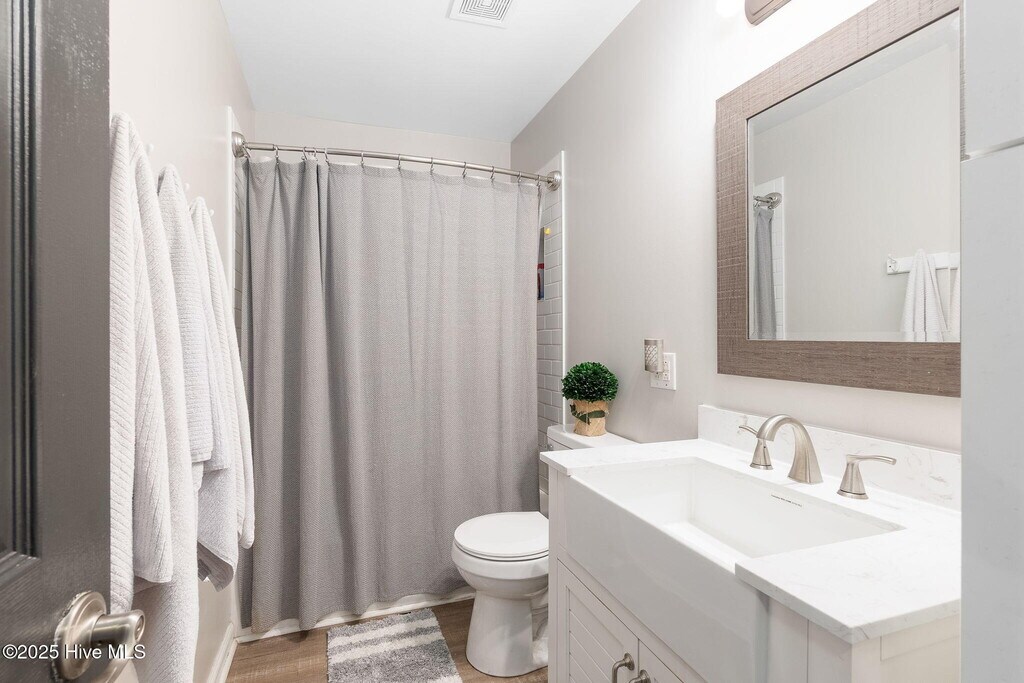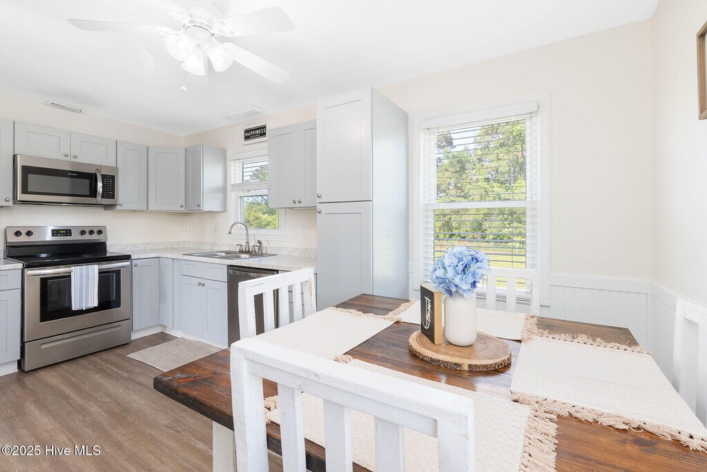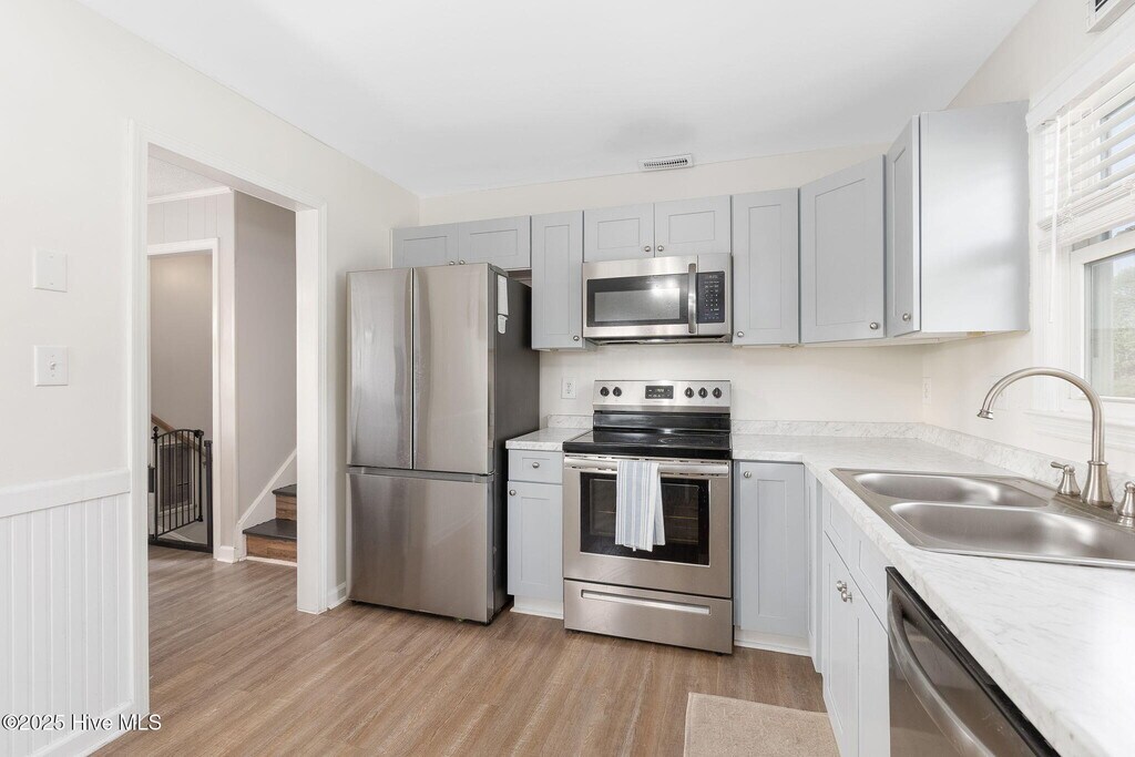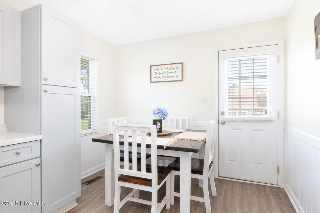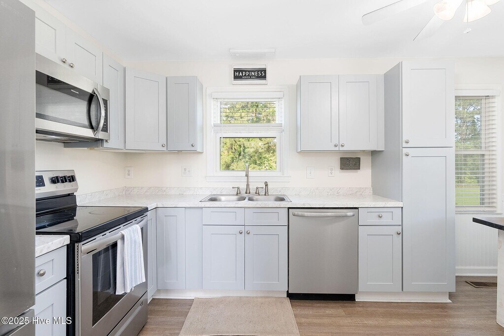 his modern home is nestled in the Rollingwood Acres community and features 3 bedrooms and 1.5 baths, providing ample space for comfortable living. Recent improvements include fresh paint, new HVAC units, 2-year-old water heater, graded front yard, landscaping and rear deck. This beautifully maintained split-level home offers an ideal layout for families seeking space, privacy, and functionality. With its thoughtfully divided levels, the home allows for both togetherness and separation-perfect for today's busy lifestyles. As you enter the main level, you're greeted by a welcoming family room with large windows and natural light that flows into a bright, spacious kitchen, ideal for home-cooked meals with fresh ingredients from the nearby farmer's market, or your own garden. Upstairs, you'll find cozy bedrooms, including a primary suite with plenty of closet space. This level offers privacy for restful nights while keeping younger children or guests close by. Downstairs, you will find a large den with sliding glass doors leading to a covered patio. Adjacent to the den is a half bath and large laundry room with storage cabinets. located just minutes from the pristine beaches of Atlantic Beach and Emerald Isle, as well as Osprey Marina and Cherry Point MCAS making it a perfect base for coastal living. With its blend of modern upgrades and coastal charm this home presents an excellent opportunity for those seeking an accessible home in the heart of the Crystal Coast