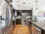 Welcome to the perfect downtown two bedroom, two bathroom condominium with an expansive 1,390 square foot open floor plan. The spacious living room/dining room is perfect for entertaining and provides plenty of room for both a large dining table and comfortable living space. The living room opens up to an oversized private terrace with over 250 square feet of space offering a serene and tranquil setting. The kitchen is complete with custom cabinetry, stainless steel KitchenAide appliances including a dual drawer dishwasher, cabinet depth refrigerator and a 36 five burner Frigidaire stove, large island, and wine refrigerator. The spacious primary bedroom features an en-suite bath and two generous closets. The two luxurious bathrooms are outfitted with Porcelanosa tile, granite vanities and frameless glass showers. Additional highlights include a high efficiency HVAC system, Whirlpool front load washer/dryer in unit, and beautiful oak hardwood floors. Municipal parking garage is conveniently located half a block away for an additional fee. Just a short distance from the Hoboken PATH, NJ Transit bus to Port Authority, shopping, dining and the Hudson River Promenade."
