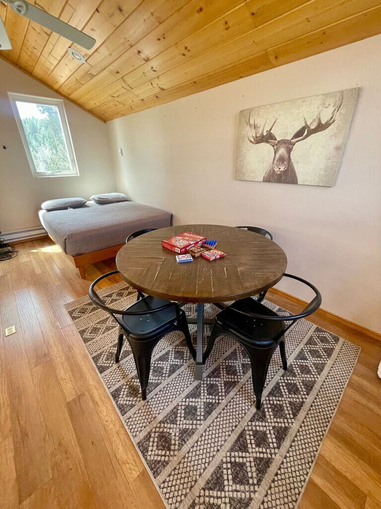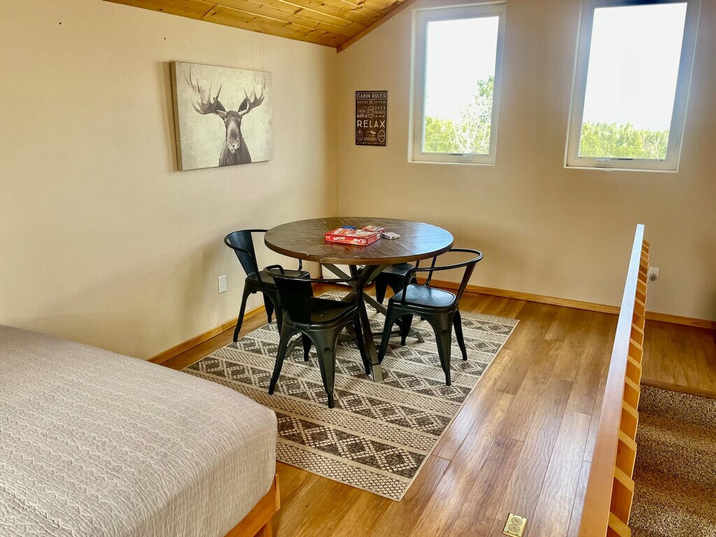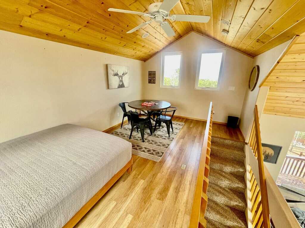 Feel at home in this cozy mountain retreat with frequent wildlife sightings, including bears, deer, and turkey that regularly roam through the yard. This home features a kitchen with a refrigerator, stove, microwave, regular coffee pot and Keurig, a crock pot, water dispenser, and is stocked with pots and pans, dishes, and basic spices. The living room has a fireplace, couch with recliners on each end, two chairs, a bench, and access to the rear deck and loft. There are two large humidifiers in the house for guests' use, which is very beneficial in the winter months as it can get dry up in the mountains. Enjoy the hot tub with a view of the mountains. Located in a neighborhood of mountain homes with beautiful views of Woodland Park, this home is about 13 minutes from downtown Woodland Park. You may encounter wildlife, as it is common to see deer, turkey, and bears roaming around. Colorado Springs Airport is 36 miles away, about a 45-minute drive, and Denver Airport is a two-hour drive. It is 39 miles to the Air Force Academy, 20 miles to Manitou Springs, 24 miles to Garden of the Gods, 26 miles to Cripple Creek, 61 miles to Royal Gorge, and 6 miles (15 minutes) to Charis Bible College. Some of the roads are steep, so 4WD or AWD will be necessary in the winter. Uber and taxis are available but may be difficult to get on short notice, and 4WD or AWD is highly recommended. Includes a desk and printer in the loft. [SI]